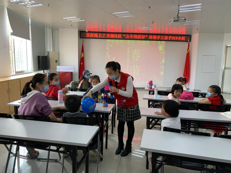 迎着冬日的暖阳,伴着喜气的音乐,1月25日,爱在路上之“金牛迎新春”传统手工亲子DIY小组在龙湖社区党群服务中心二楼活动室顺利开幕。社区八个亲子家庭共17位居民参与了本次小组的第一次课程。