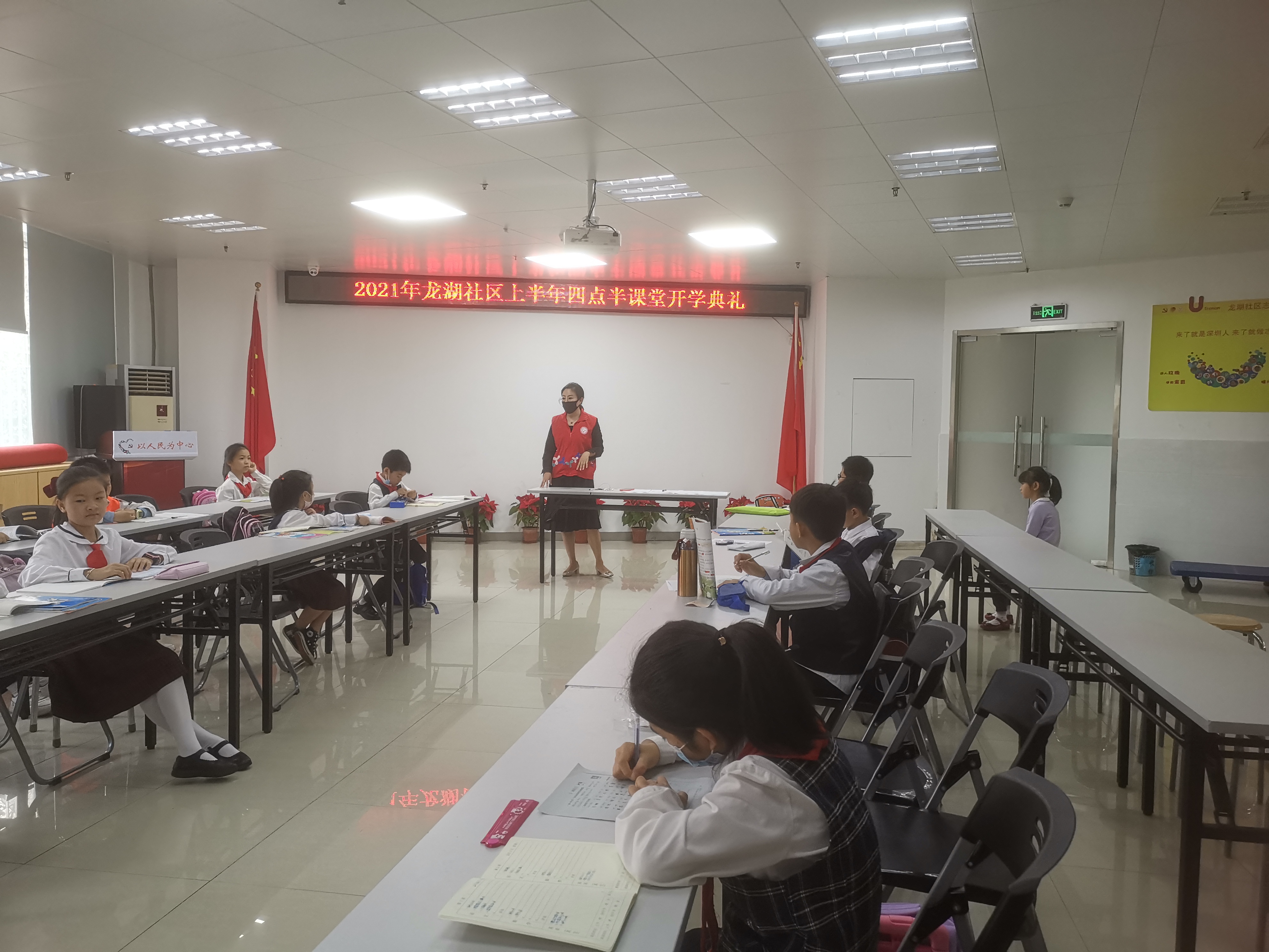 3月1日下午,龙湖社区党群服务中心活动室正在举行2021年龙湖社区上半年“四点半课堂”开学典礼,吸引了近20余名家长及孩子前来参加。
