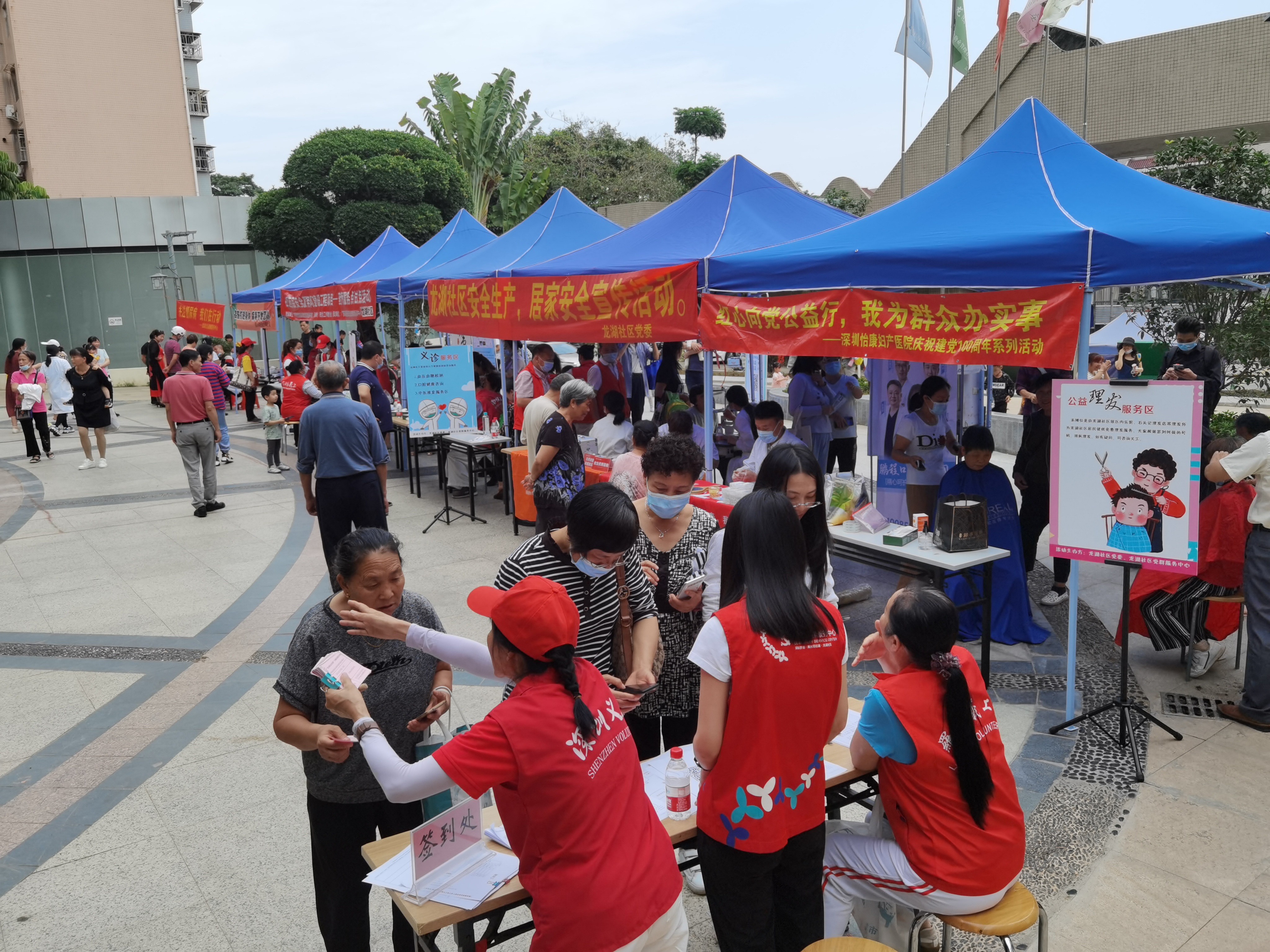 据悉,党史学习教育开展以来,龙湖社区党委组织党委班子与支部书记、委员一起,走访小区门店、企业和群众时发现,随着时代的发展,像磨刀、改衣服的服务越来越难找到,而许多企业或个体门店主,他们虽然有参与志愿活动强烈意向,但却苦于没有足够的时间。于是一场旨在把群众需求放在心上,把暖心服务落到实处的党群志愿活动应运而生了。为了方便居民,本次活动选在了新峻工的龙园广场举行,共分为便民服务专区、党史竞答专区、政策宣传专区、微心愿征集专区等4个专区,共15个摊位。在便民服务专区,居民可体验义诊、义剪、中医按摩、修眉、磨刀、改衣服等等便民服务,在政策宣传区,居民可以了解到文明养犬、反诈骗、疫苗接种、安全生产、禁毒、垃圾分类等知识,晶报社区党委还通过图文并茂,实际操作的形式,详细介绍了晶报APP上的各种便民服务活动,妈妈读书会也在现场开展中华好儿女有声电台主播招募推广,让更多居民了解阅读、走进阅读。