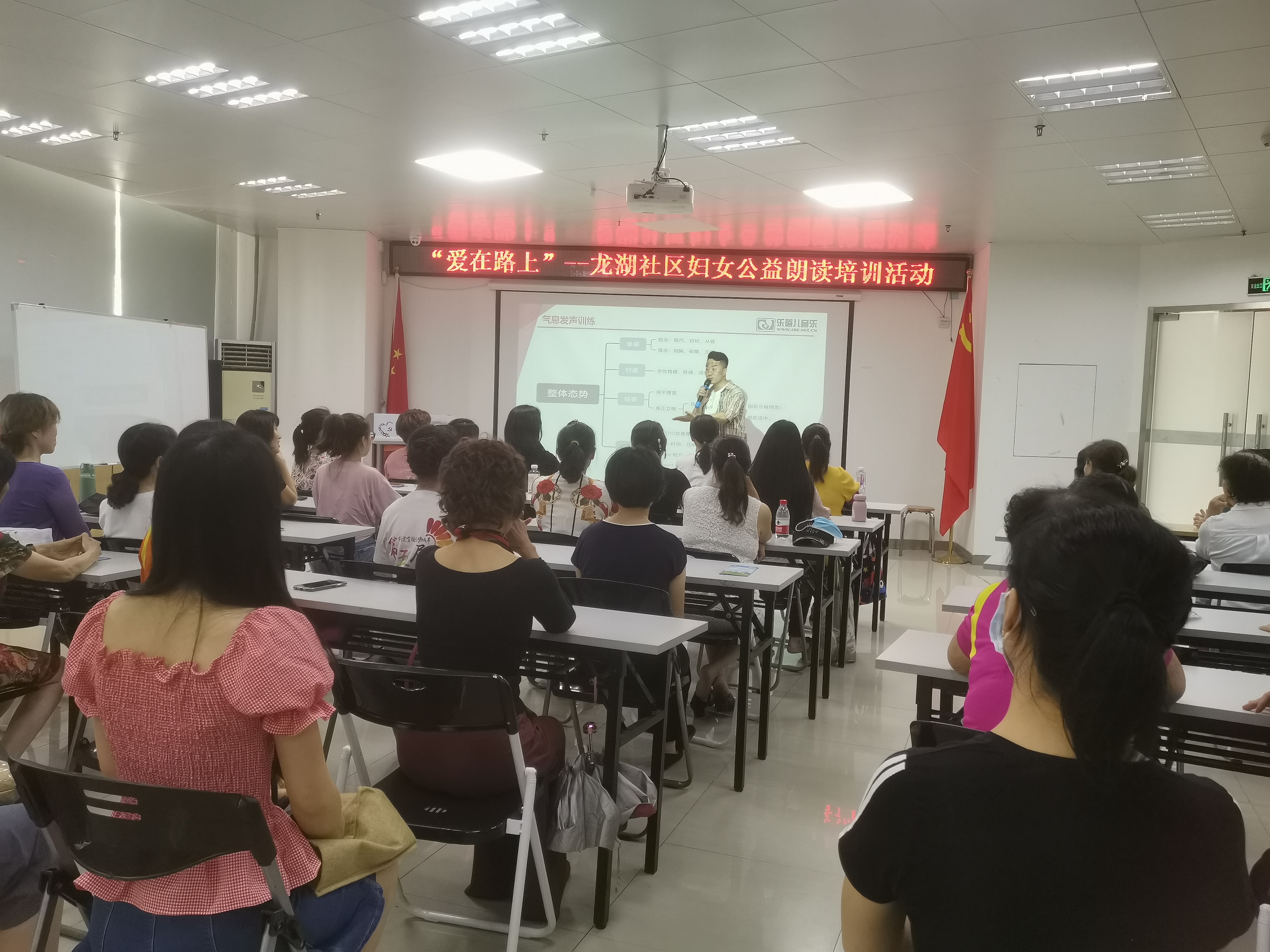 为满足社区女性对自我朗读技能学习与提升的需求.5月11日,龙湖社区开展了“爱在路上”--龙湖社区妇女公益朗读培训活动,共吸引了38位女性居民参与。活动邀请到了德国乐蓓儿奥尔夫教研总监、大角色儿童艺术团创办人、中国语言朗诵协会的祁升耀(奥子)担任培训讲师。