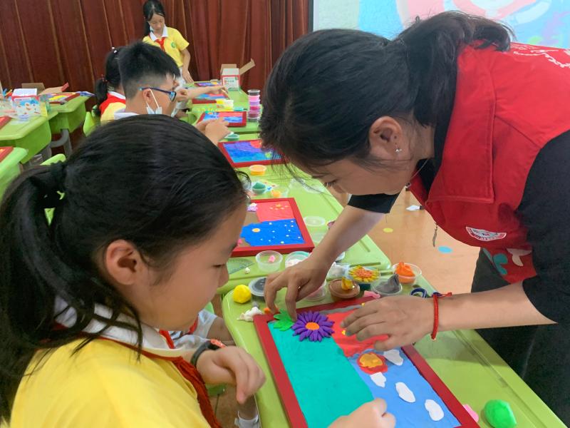 接下来,田社工讲解了本次活动的意义及粘土画制作方法后,小学生认真地用各种颜色的轻粘土进行揉捏拼接,五星红旗、鲜红的党旗、蓝天白云绿树,幸福牵手的小朋友……孩子们将自己对祖国、对党的美好祝福变成一个个鲜活的场景,用作品一一呈现。