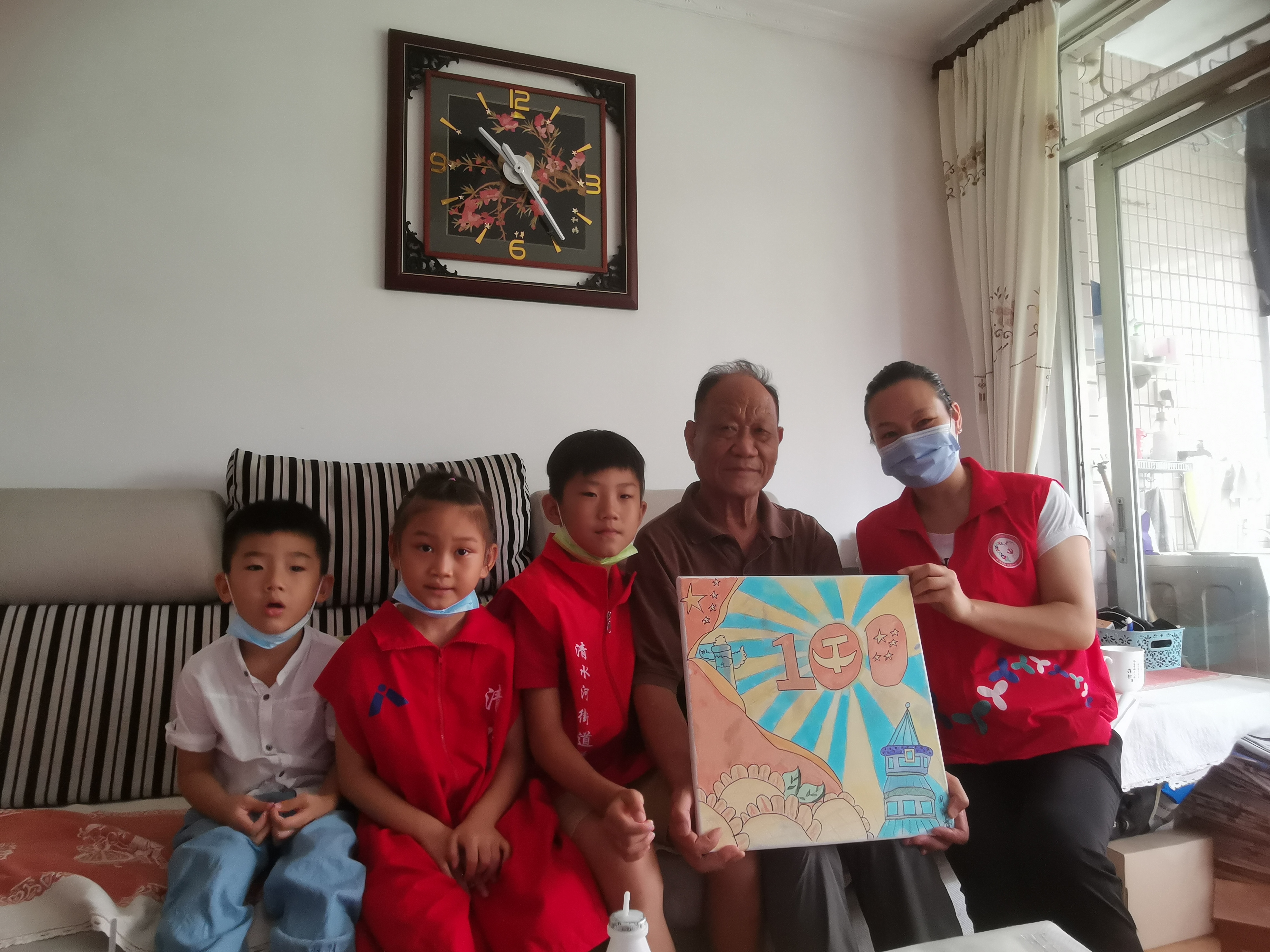 据悉,本次赠送给老人家的画是小朋友在专业绘画老师的指导下,亲手绘制了“建党100周年”主题绘画,画中蕴含了自己对党的颂扬、对祖国的热爱。小义工们首先来到爷爷奶奶家中,由社工带领大家和长者们亲切交谈,了解了其家庭情况、目前身体状况、存在哪些需求、渴望得到哪些帮助等实际问题等等,并一一记录下来,以做好跟进服务;然后小义工们与长者们虚寒问暖、聊家常,并亲手把画送给了爷爷奶奶们。雄伟壮丽的天安门,鲜艳的五星红旗、中国共产党党旗,爷爷奶奶很是开心,其中龙爷爷接过一位琦琦小朋友的画高兴的说:“画的真好,我要把它裱起来挂在墙上。临走时小义工们还叮嘱爷爷奶奶们要保重身体,下次再来看望他们,令老人家感动不已。