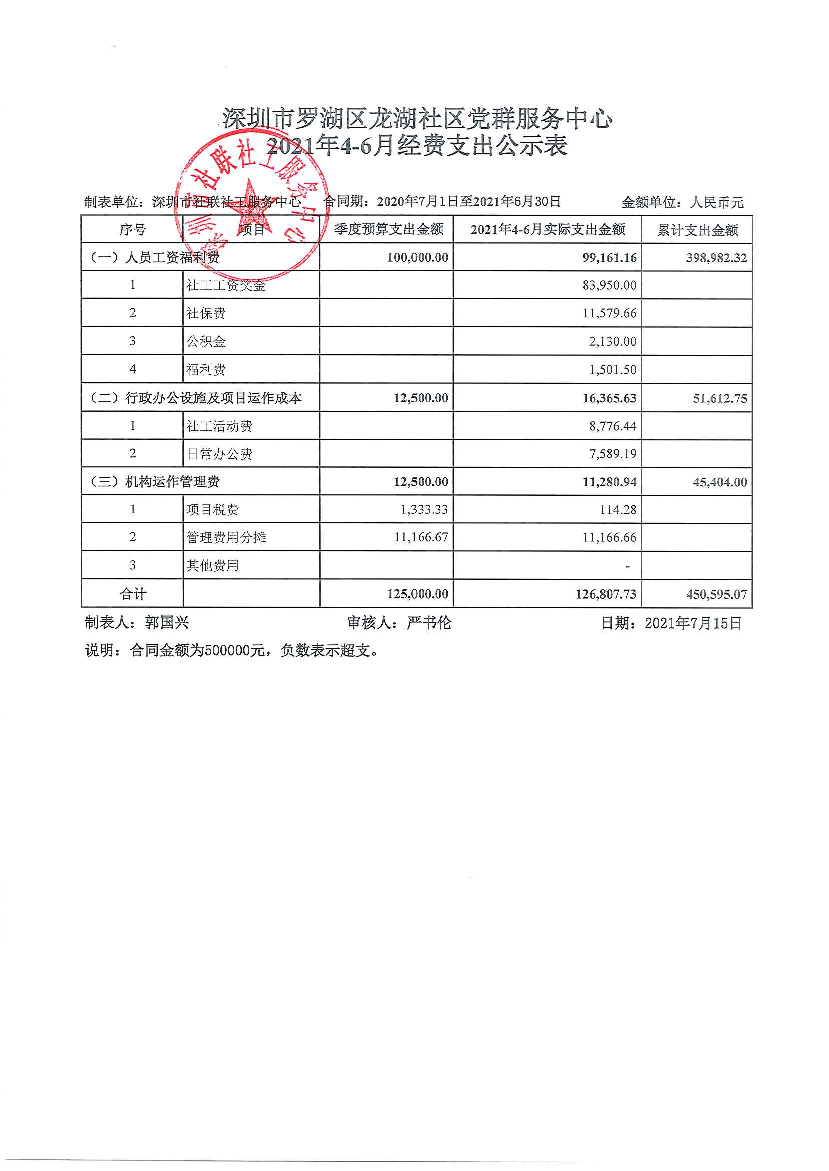 【深圳社联】深圳市罗湖区龙湖社区党群服务中心2021年4-6月经费支出公示表