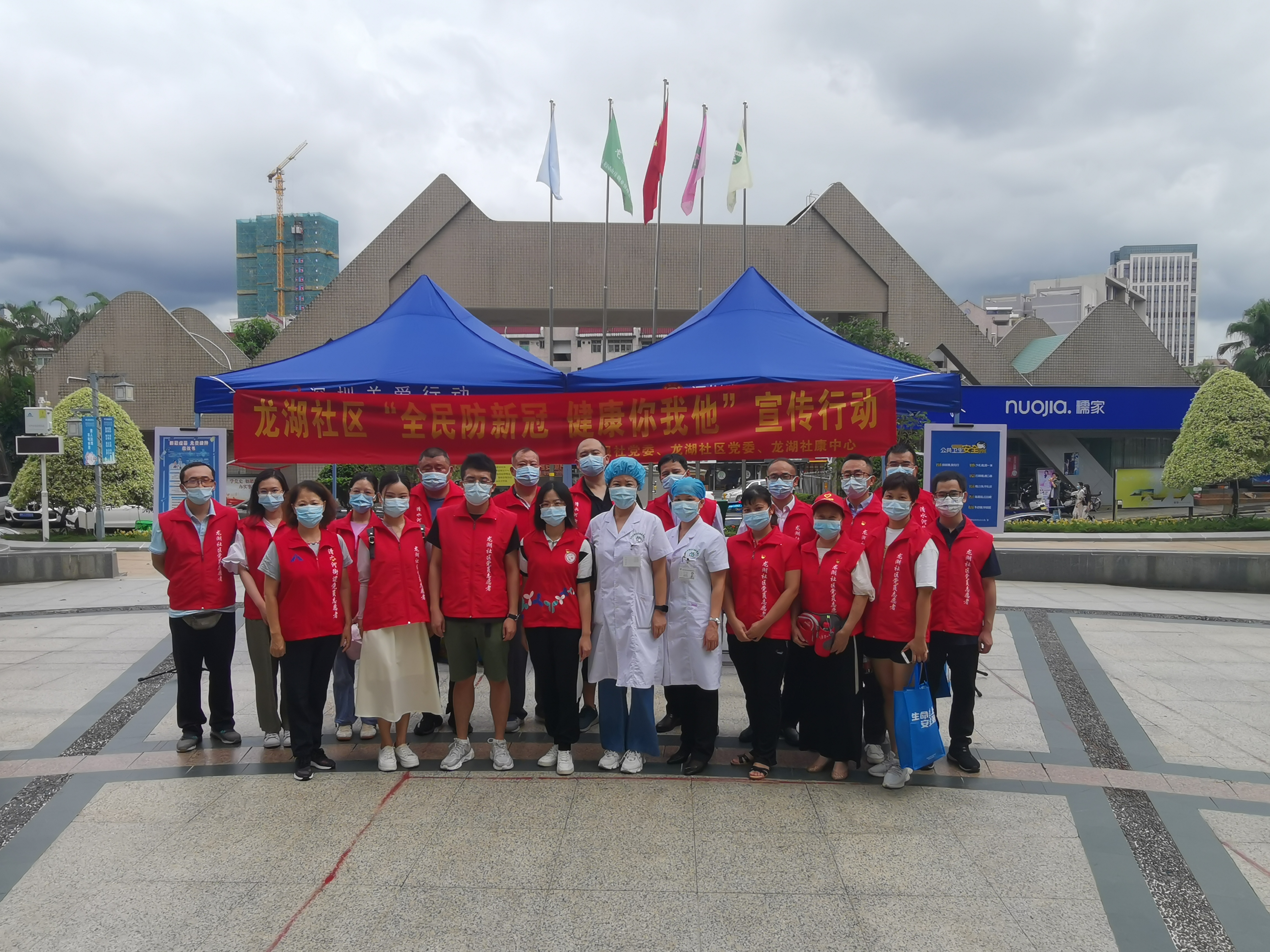 当前国内疫情多点散发,为提高群众防控意识,筑牢疫情防线,2021年8月14日下午,龙湖社区党委积极响应号召,联合共建单位晶报社区党委、龙湖社康中心,组织社区工作者、党群义工、医护人员等近30人共同参与“全民防新冠、健康你我他”宣传行动,充分发挥基层党组织的战斗堡垒和党员先锋模范作用,让党旗飘扬在战疫一线。