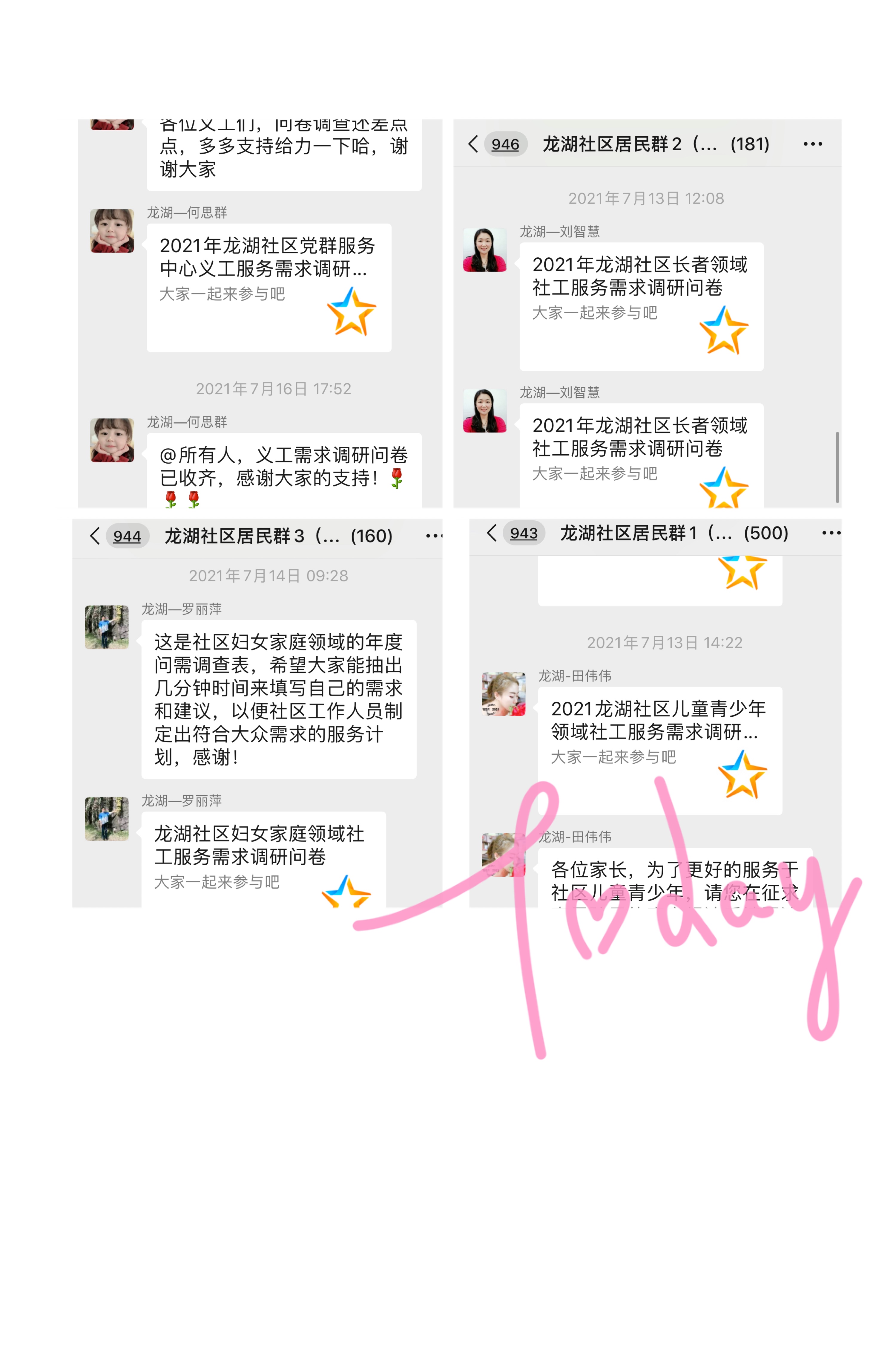 本次调研在聆听各方需求表达上,中心社工了解了社区基本情况、社区资源、社区社会组织,以及居民各种诉求,下一步社工将对收集的调研资料进行分析,做好居民服务遴选,规划年度服务计划,同时在社区党委的统筹领导下,推动社区党委、居委、物业、企业、志愿者的联动共建共治,进一步发挥“四社联动”的作用,充分调动居民参与的积极性,提升居民自治意识和自治能力,共建美好龙湖。