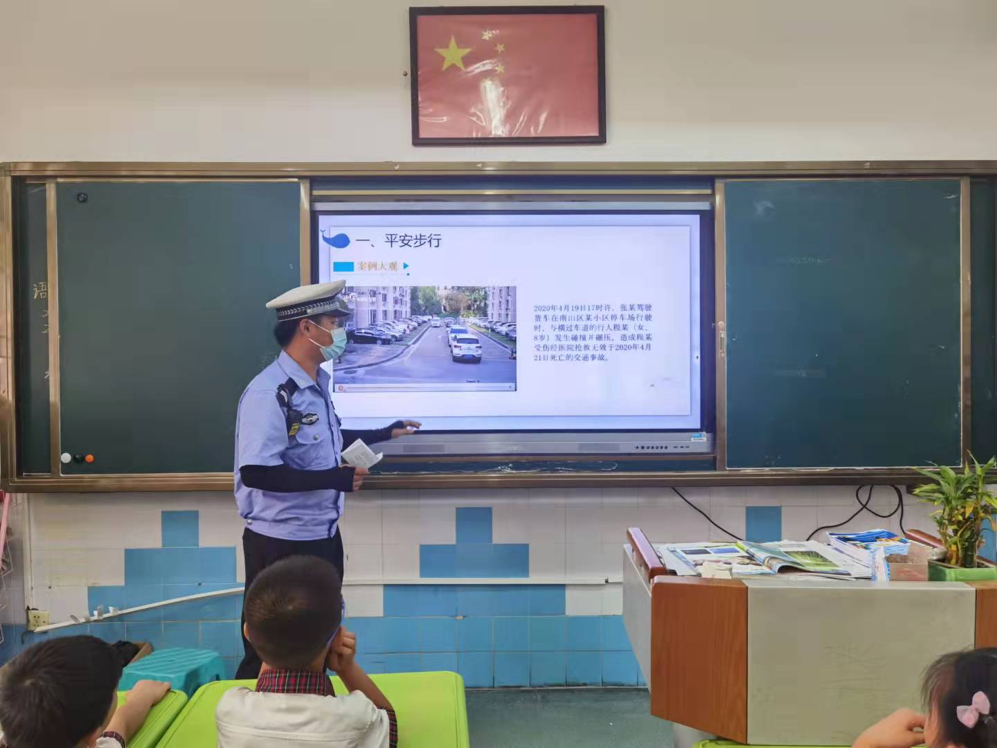 课堂上,交警结合学生上下学日常出行实际,提前制作交通标志图片,使用通俗易懂的语言,对闯红灯、汽车盲区、安全带等方面的知识,以及出行中可能会遇到的一些交通危险进行了详细地讲解,同时教给同学们一些躲避和防范危险的安全常识,并叮嘱每位同学都要遵守交通法规,增强防范意识,提高自我保护能力。课后民警还向学生家长介绍“一盔一带”安全守护行动开展的意义,提醒家长接送孩子遵守交通法规,骑乘摩托车、电动车要戴安全头盔,驾乘汽车要系安全带,不随意横穿马路、不闯红灯等,给孩子做好榜样,让学校、家庭、交警部门共同形成良好的交通安全宣传氛围。