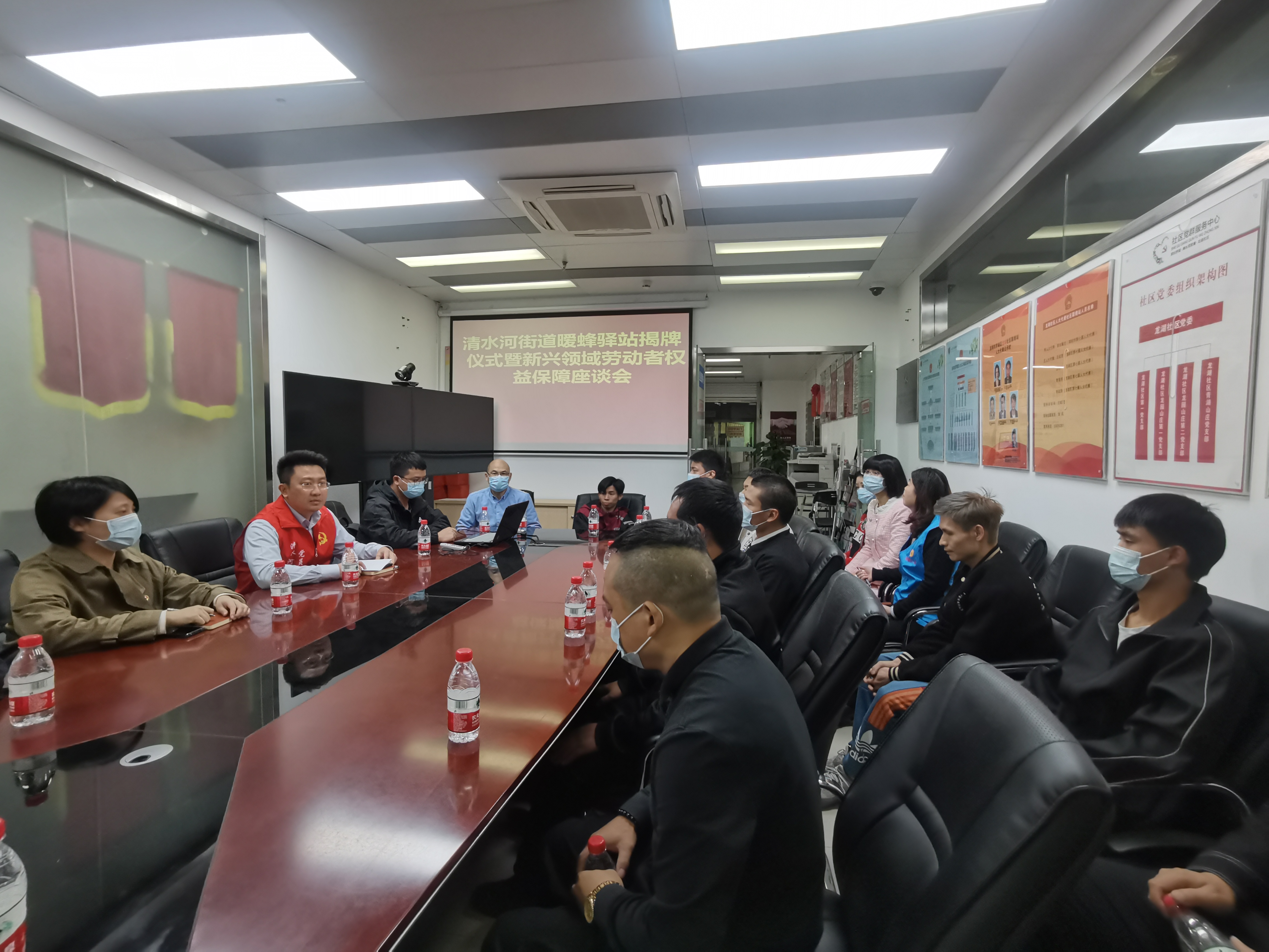 为贯彻落实习近平总书记对新兴领域党建工作的要求,进一步加强对新兴领域从业者的关心关爱,11月23日下午,清水河街道党建办在龙湖社区工作站举行“暖蜂驿站”揭牌仪式暨新兴领域劳动者权益保障座谈会。会议由党工委委员、党建办主任、两新党工委副书记、街道总工会主席柳通主持,他表示,要将党建引领深入落实到快递、物流、网约车等新兴行业,用心用情用力为他们提供更好的服务,全力打通党组织服务群众最后一百米,让大家充分感受党的关怀和温暖。街道总工会也将加大对新兴领域从业人员权益保障的呼吁,争取更多行业主管部门对新兴领域从业者权益保障政策的关注。