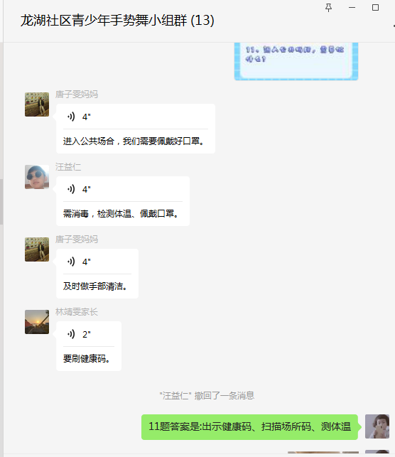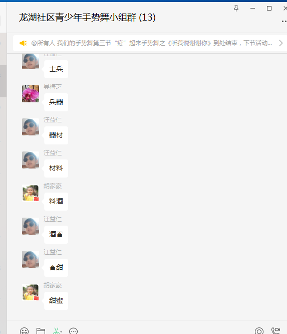 活动结束后,社工鼓励组员继续在群里相互交流和分享流行的手势舞,也可以邀请身边对手势舞感兴趣的朋友进群一起交流、分享和相互学习。有成员表示,此次手势舞学习给疫情在家学习的学生们带来了生活乐趣,也提高了居家防护的有效意识。疫情无情,人间有情,通过此种方式的学习鼓励,我们坚定阳光总在风雨后!