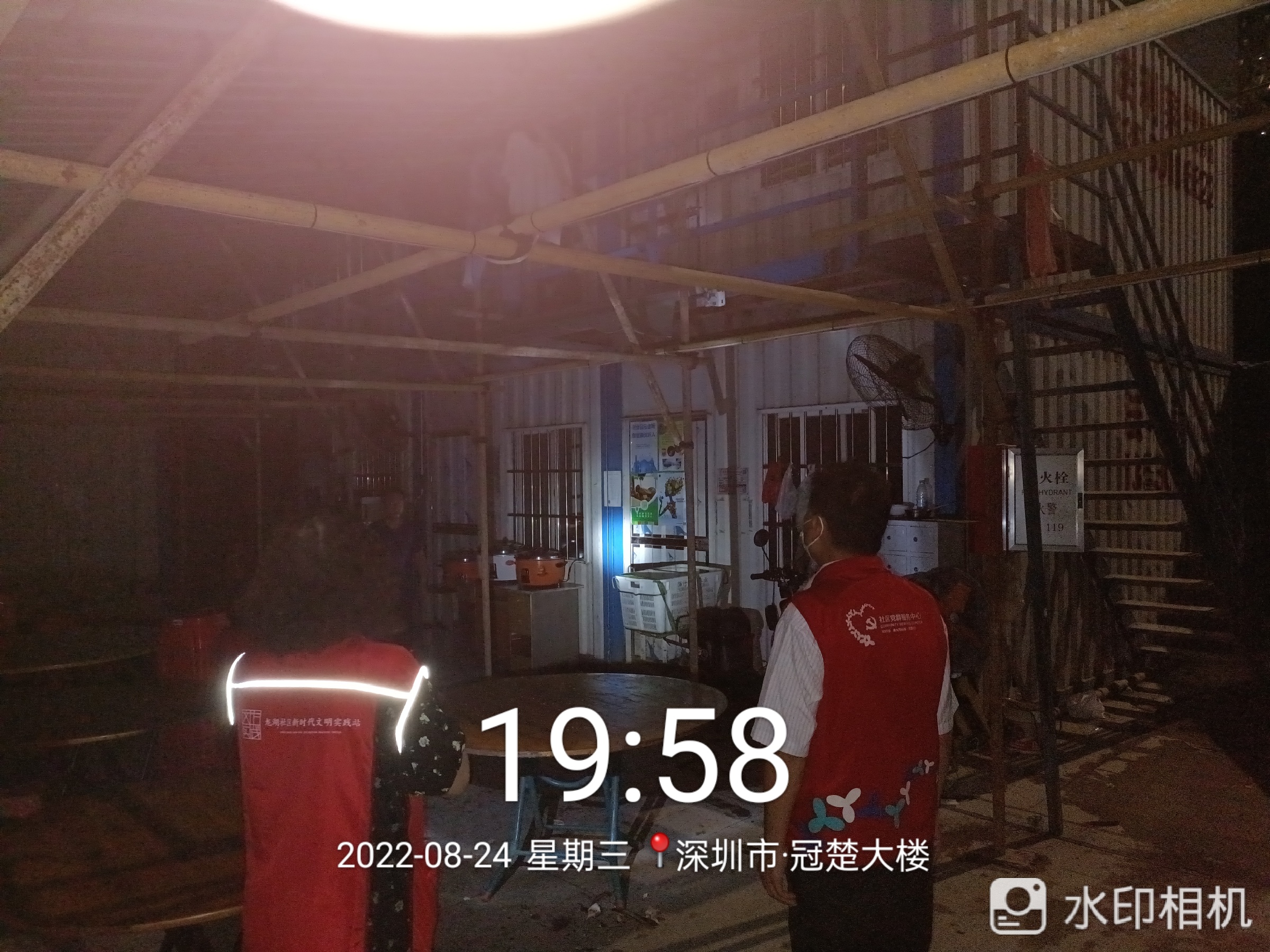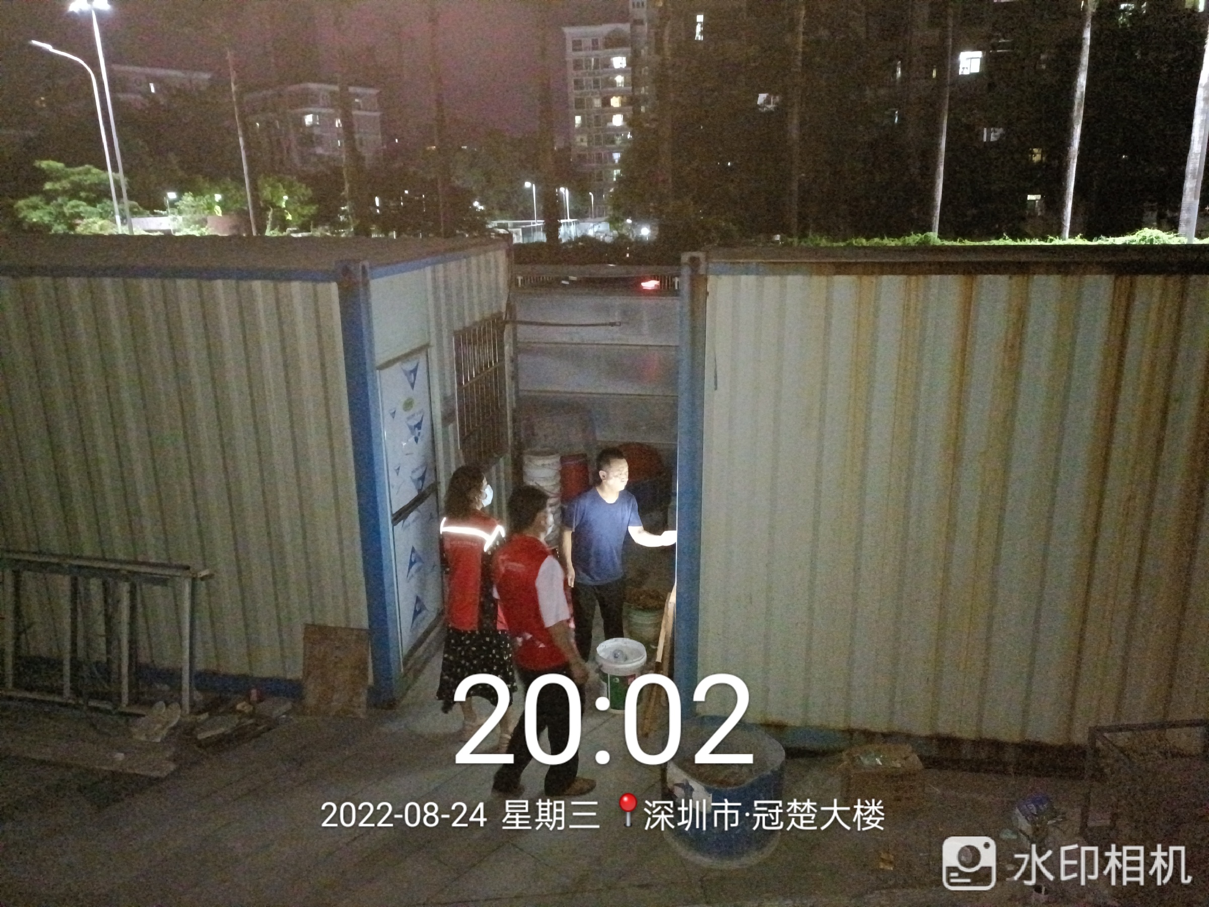 8月24日晚,为切实做好抵御台风“马鞍”各项工作,龙湖社区党委书记谭颖葵带队检查各核酸点物资撤移及工地人员安全转移情况。龙湖辖区临时核酸点、电动车上牌代办点帐篷等设施已全部安全撤离。小公园固定核酸点帐篷已收拢绑紧并拉铁丝固定。冠楚大楼工地、青湖工地集装箱除值班值守人员,其他已全部安全转移,现场内水电总闸已断。已要求各负责人坚守值班制度,加强巡查防守,并注意自身安全防护,有情况及时向社区反应,保证台风期间安全稳定。