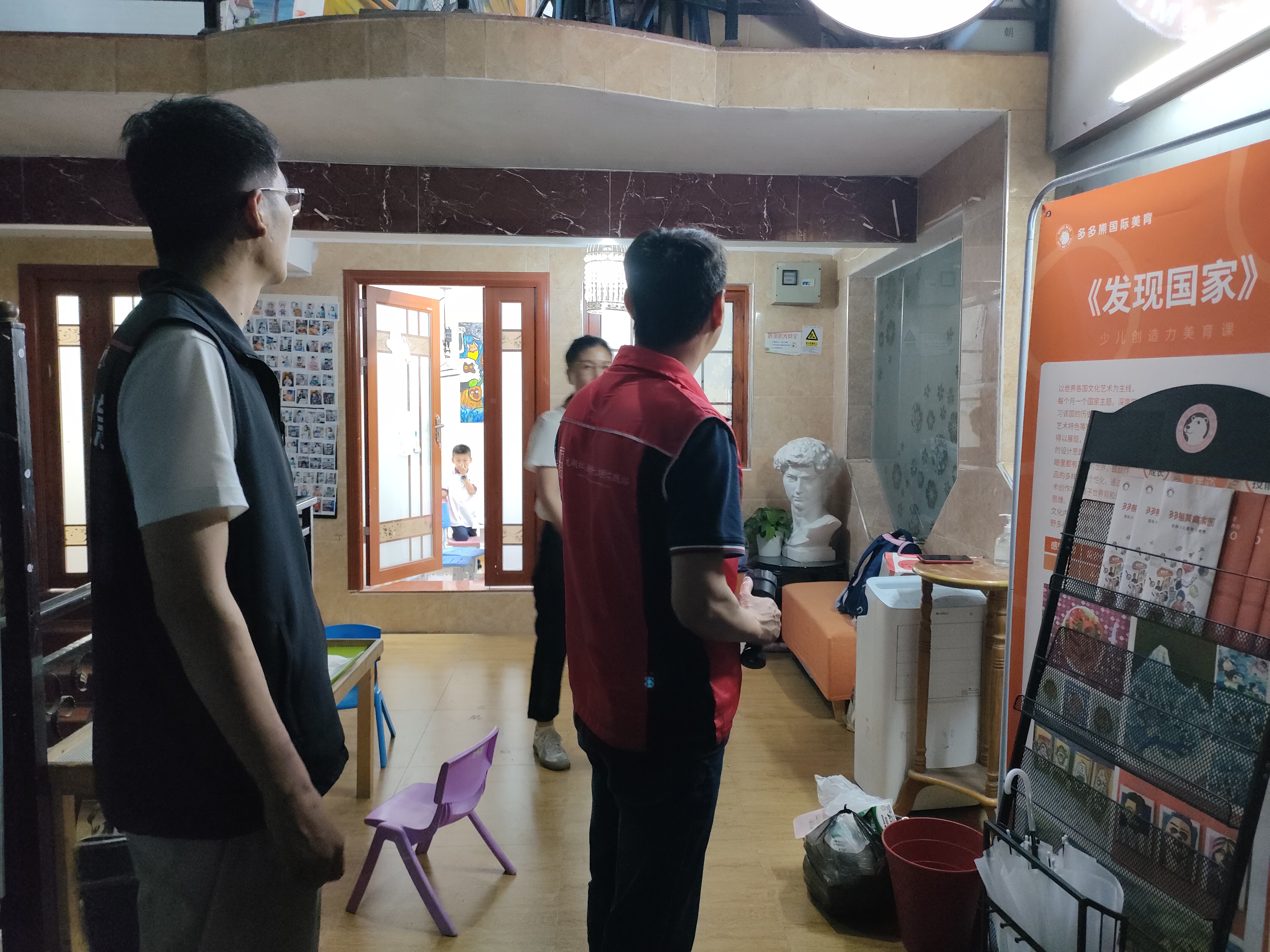 3、贝贝优教育,灭火器未点检、安全逃生通道锁扣损坏,不能打开。(已要联系人员维修,并且在营业期间必须打开。下星期复查)