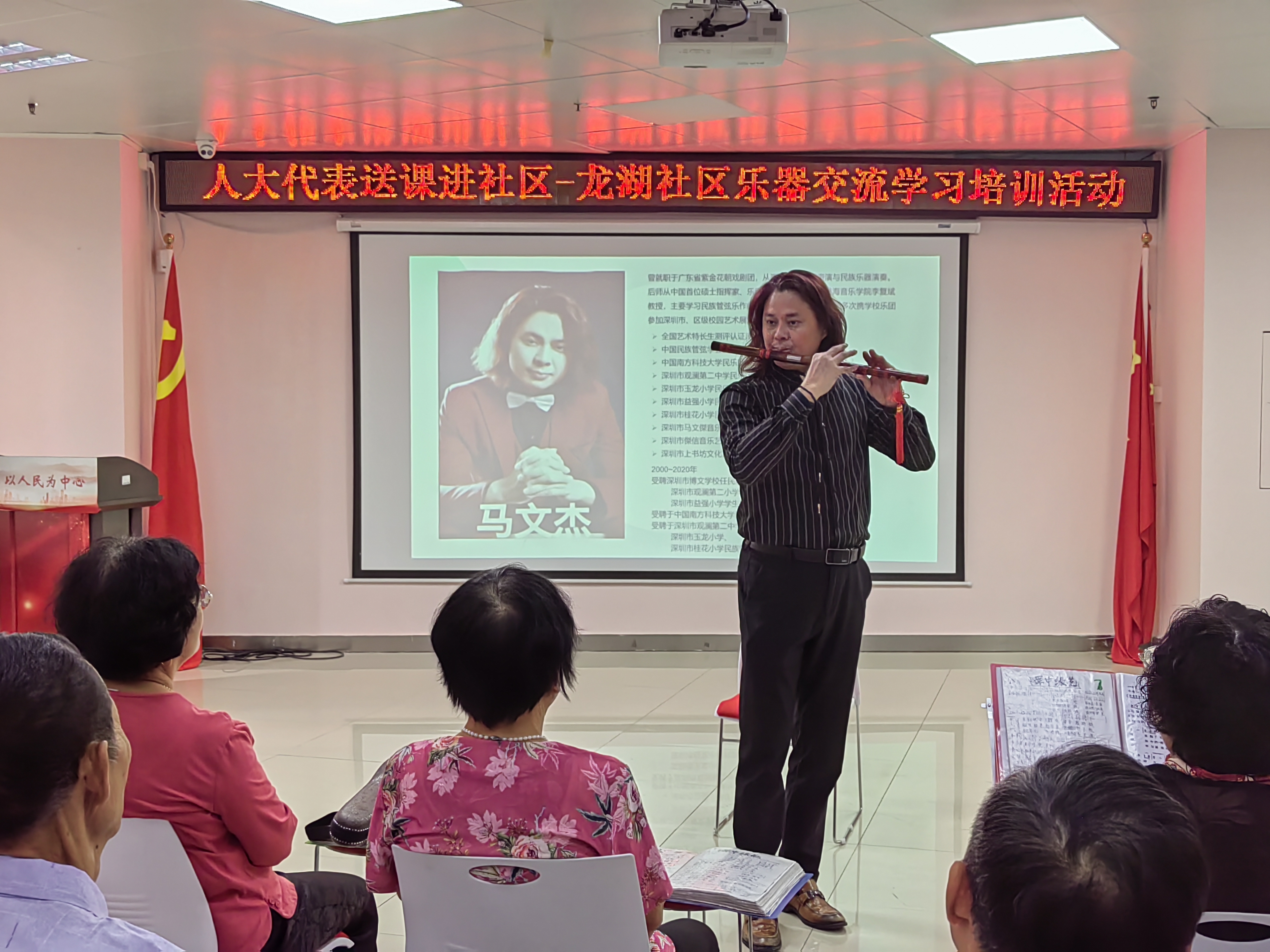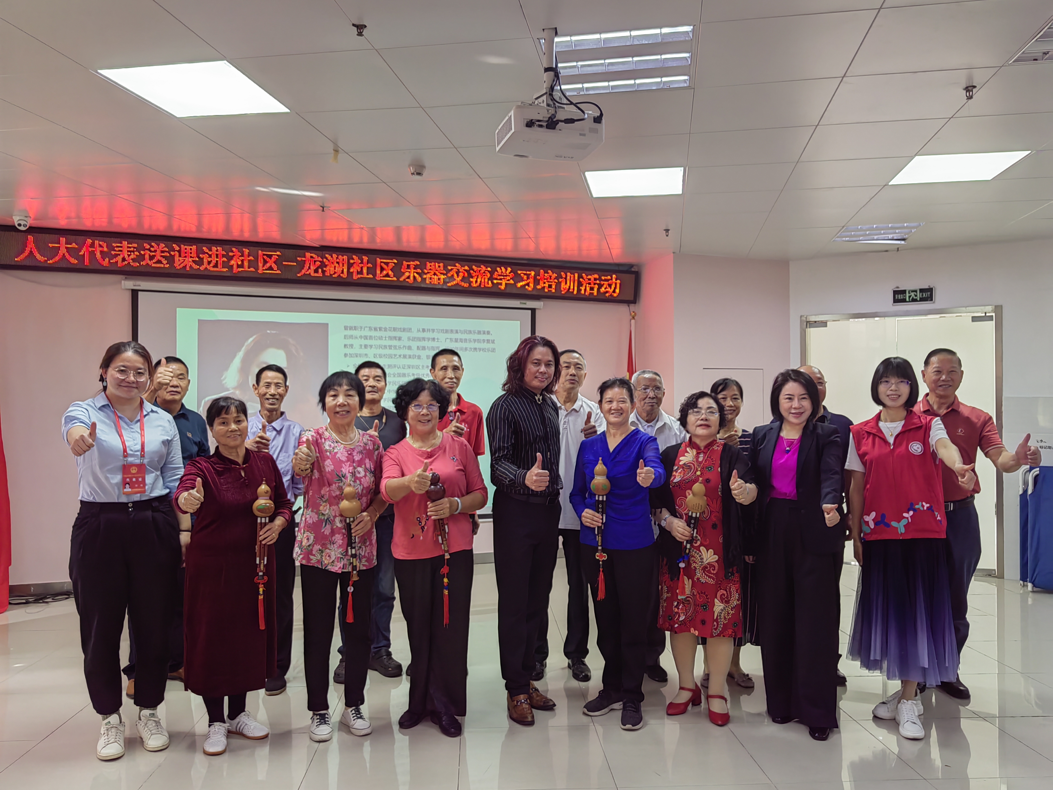 2023年10月17日上午,在龙湖社区党委的大力支持下,龙湖社区党群服务中心社工携手深圳市深传科技集团有限公司在新时代文明实践大讲堂开展了“人大代表送课进社区——乐器交流学习培训活动”,共有19名乐器爱好者参与。活动中,市人大代表吴刘菊兰、区人大代表刘晓亲临本次活动现场,给居民送上祝福,亲切的和居民交流合影。