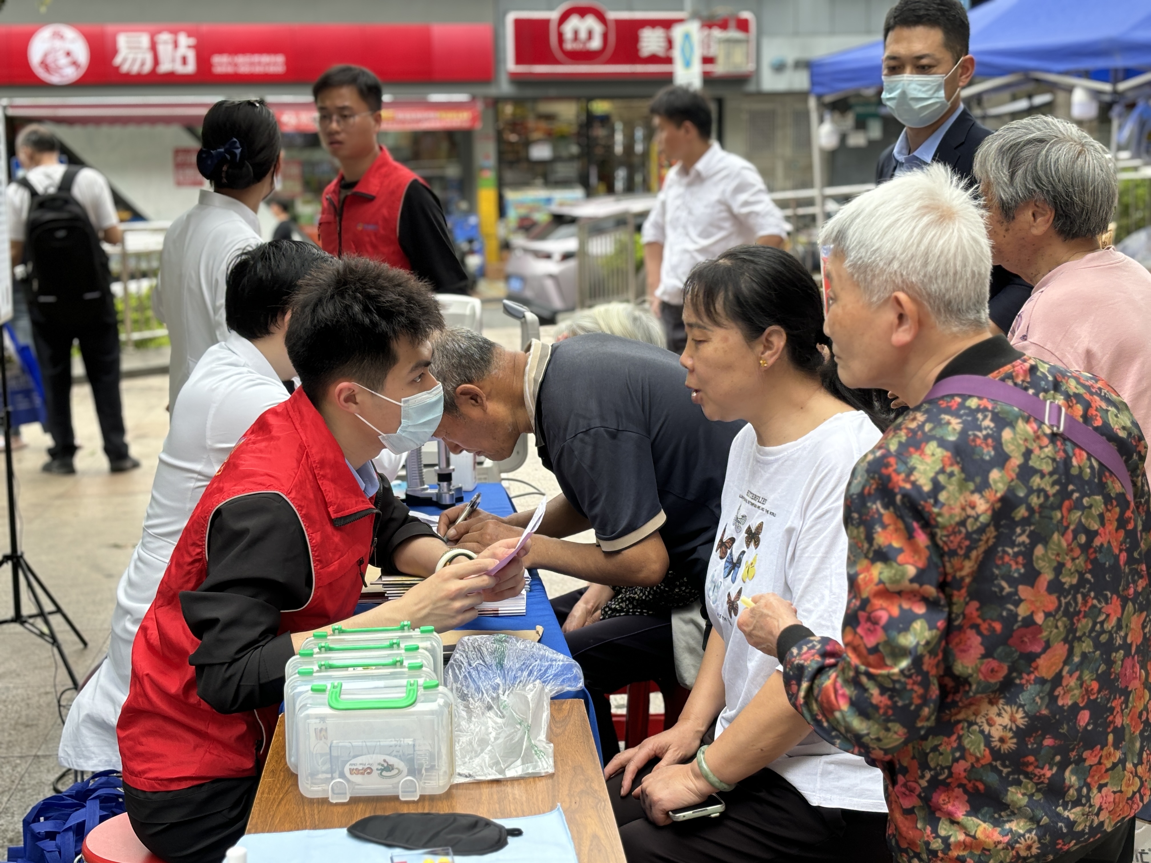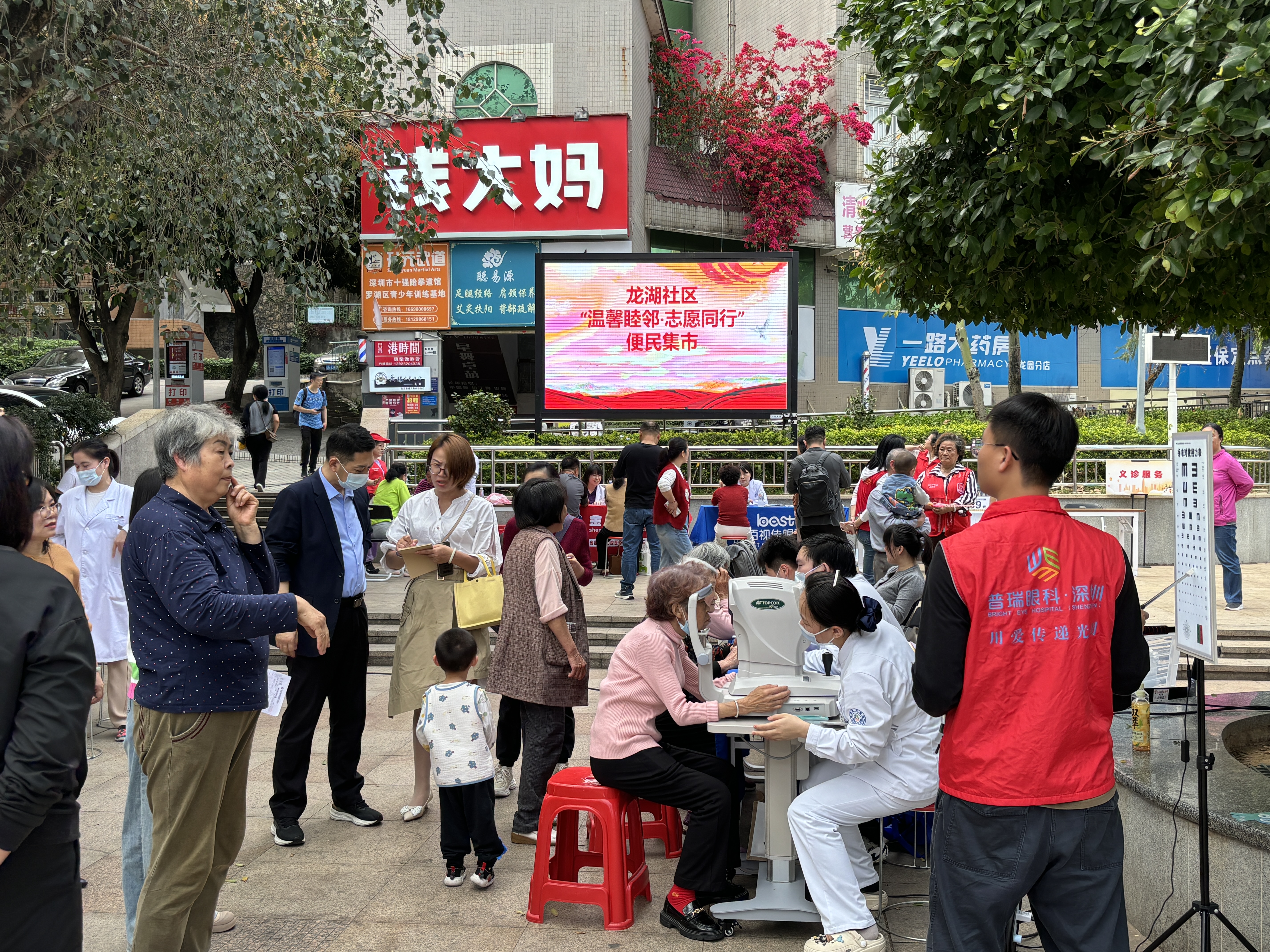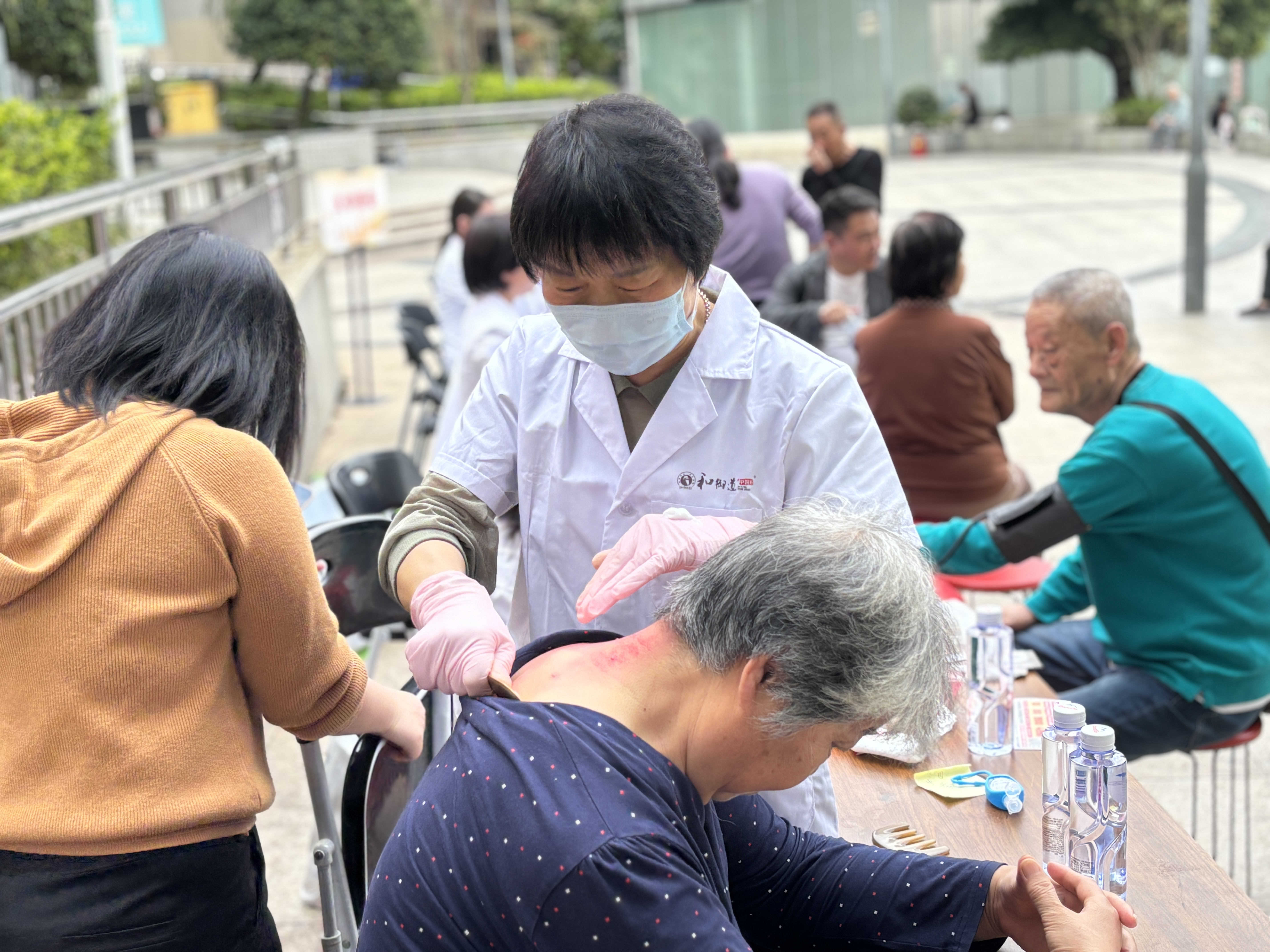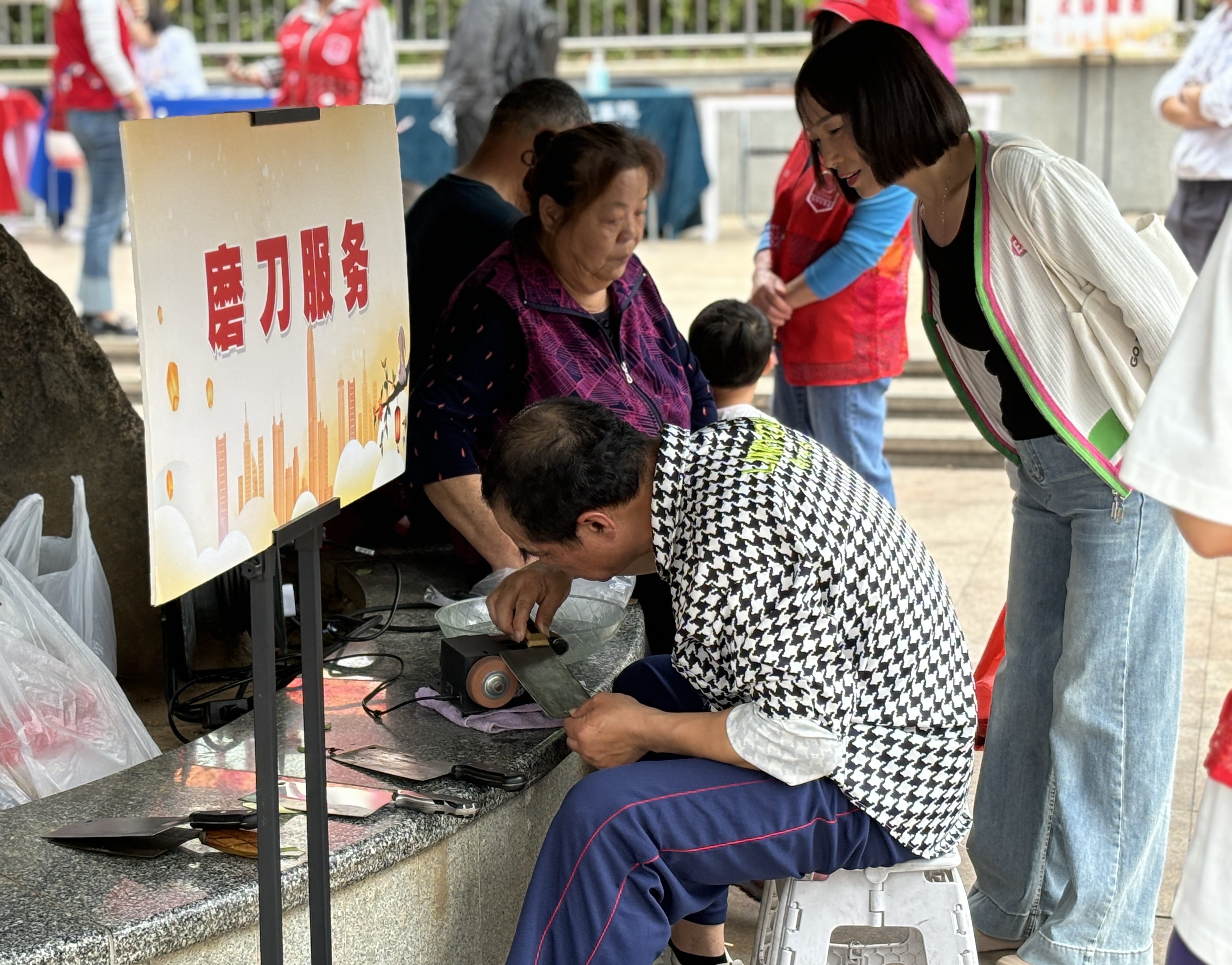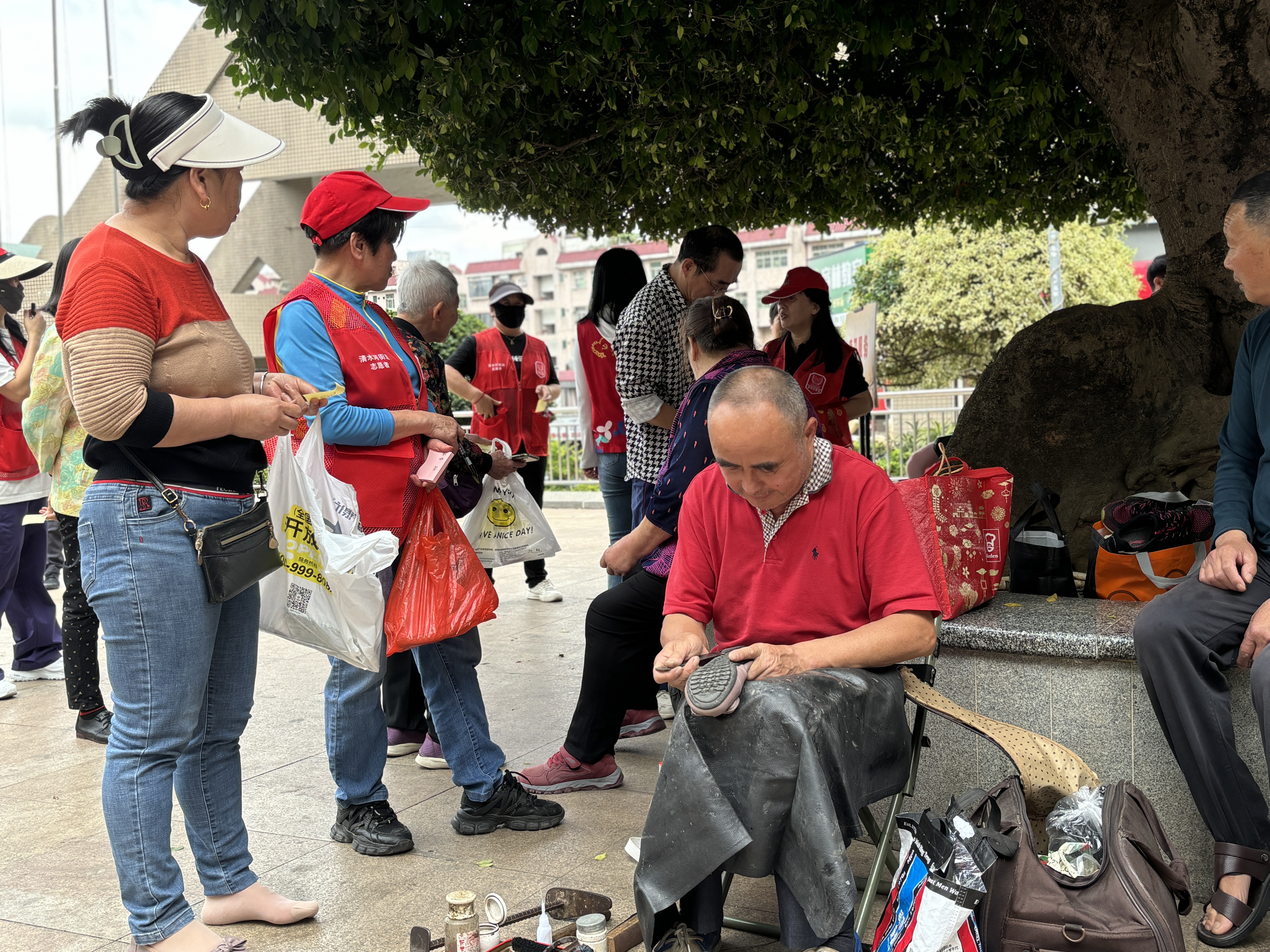 随着志愿项目授旗仪式的完成,志愿者们、爱心商家也在社工的带领下有序准备起了“睦邻服务集市”的开展工作,龙园大厦广场瞬间化身为“睦邻服务集市”,磨刀补鞋、刮痧理疗、牙科咨询、眼科检查等十余个便民摊位有序排开,吸引二百余名居民驻足参与。张阿姨带着两把钝刀来到磨刀摊位,看着磨刀师傅专业的手法,她感慨道:“现在很难找到磨刀师傅了,社区把服务送到家门口,真是想到我们心坎里了。”眼科检查区前排起长队,医护人员不仅为居民免费检测视力,筛查白内障等常见眼疾,还科普护眼知识。活动现场还穿插政策咨询等互动环节,让便民服务既有温度又有深度。