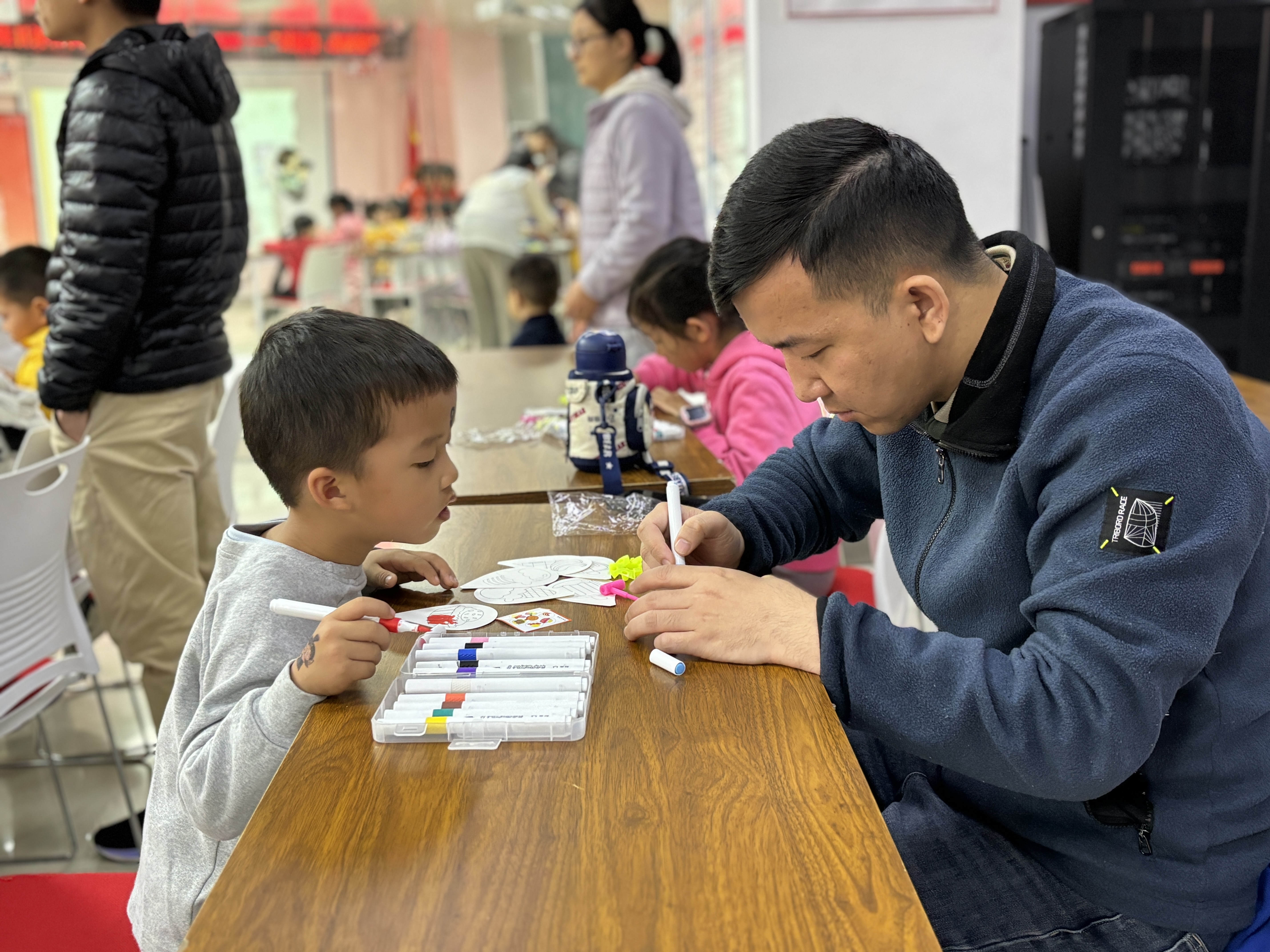 音乐热身结束后,李华老师开始与孩子们一起阅读《14只老鼠去春游》绘本,用风趣幽默的形式,让孩子们寻找14只老鼠的不同,跟随小老鼠一家的视角,一起看春天的风景,认识春天的植物。随后,家长与志愿者们共同引导孩子们制作风车手工,不一会儿,一个个由孩子们亲手制作,独具创新的风车便出现在眼前。