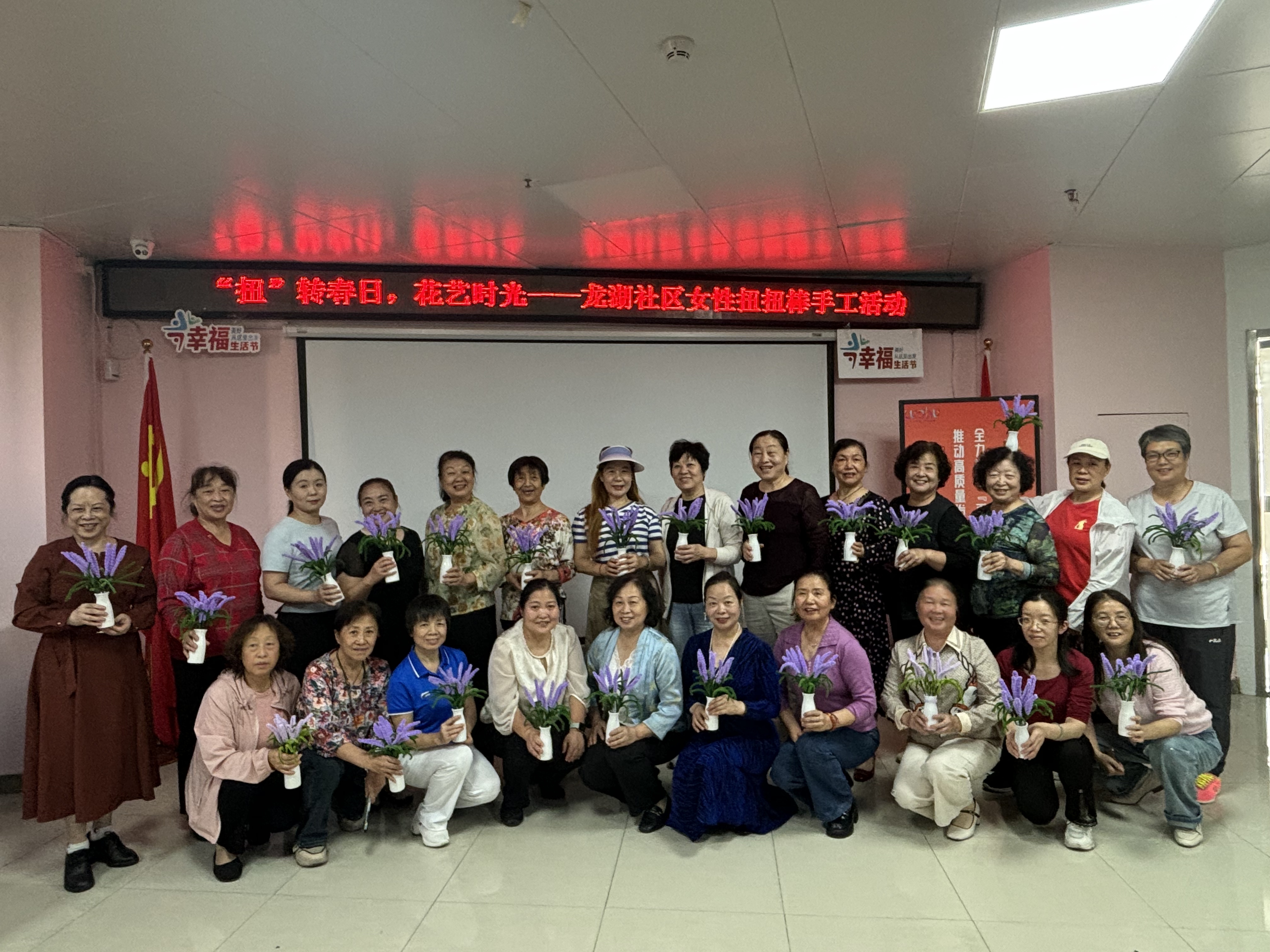 为丰富社区女性居民精神文化生活,提升艺术审美情趣,2025年4月15日下午,龙湖社区党群服务中心社工团队携手中国人寿金田支部共同举办“扭”转春日,花艺时光——女性扭扭棒手工活动,吸引24名社区女性积极参与,在春日午后共赴一场指尖与创意的邂逅。