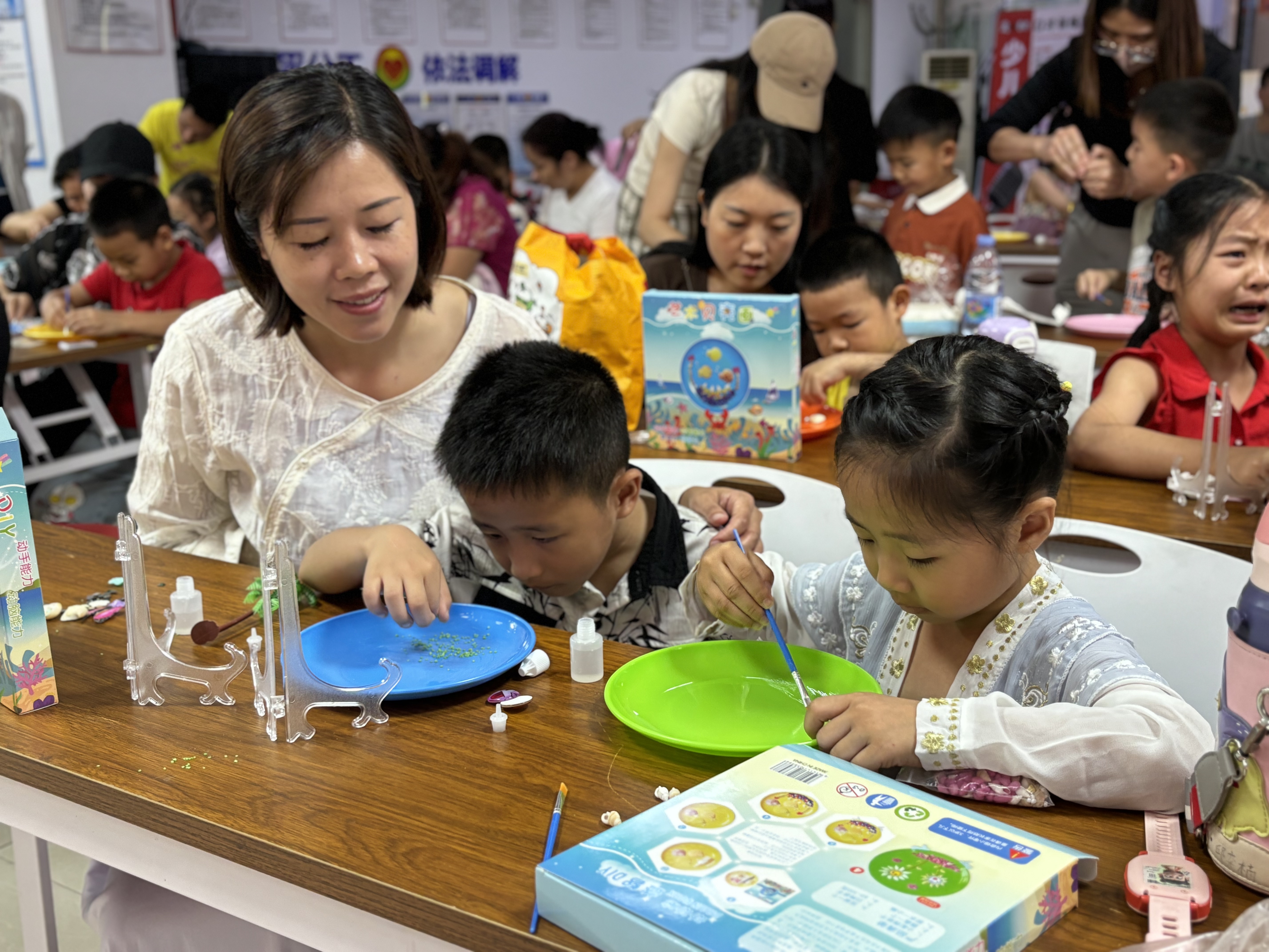 活动最后,在社区社工和“绘本妈妈”志愿团队的协助下,亲子家庭共同制作母亲节主题贝壳画。孩子们挑选彩贝、绘制图案,将心目中的妈妈融入手工作品中。一幅幅色彩斑斓的贝壳画,承载着孩子们对母亲的感恩之情,也为节日增添了一份独特心意。