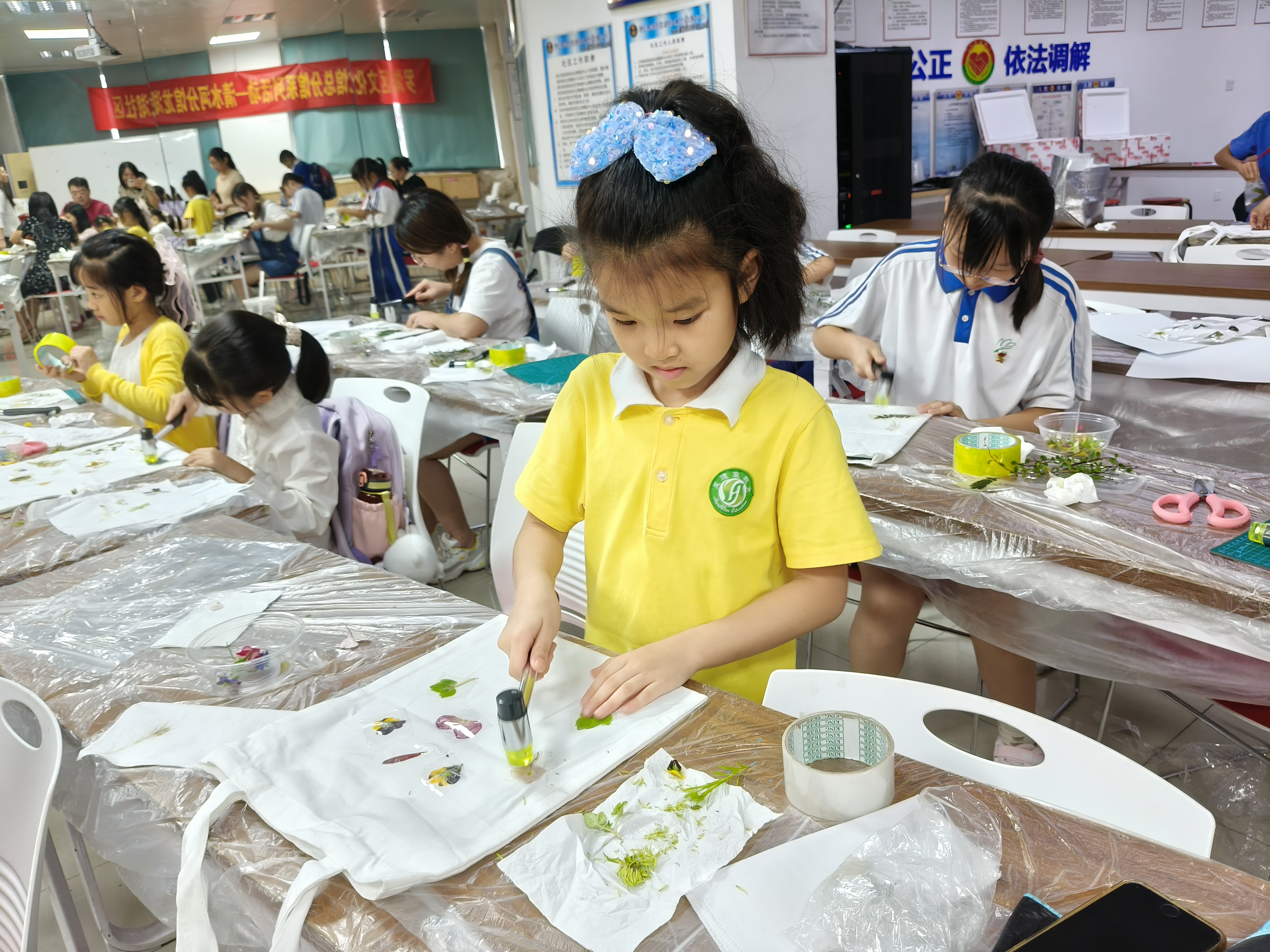 社工借助视频,带领孩子们穿越历史长河,探寻端午节的起源。同时,详细介绍了艾草、菖蒲等端午植物的民俗寓意,孩子们认真聆听,踊跃回答,不少孩子都能准确说出至少 3 种端午植物的寓意,现场学习氛围浓厚。最令孩子们兴奋的就属植物拓印创作环节。在社工和手工讲师的悉心指引下,从植物采集、科学处理,到创意设计,孩子们开启了创意之旅。他们先在方巾上尝试创作,精心挑选花卉材料,运用拓染工具,将植物的形态与色彩巧妙地留在布料上。创作完成后,大家两两一起,热烈讨论改进方案,分享彼此的创意与灵感。随后,孩子们带着优化后的想法,在帆布袋上再次创作,力求呈现出更完美的作品。