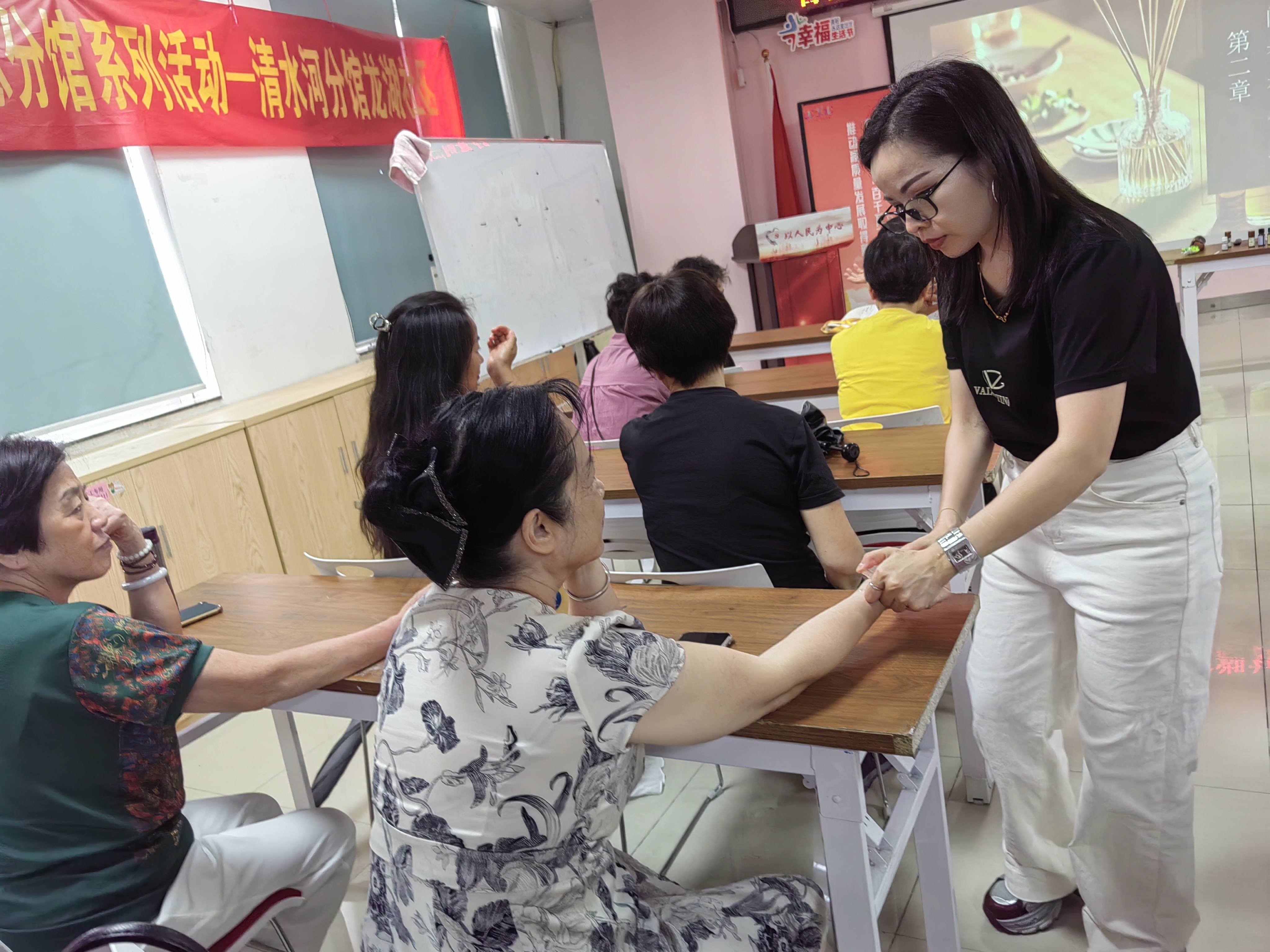 活动伊始,陆菲菲老师以 “情绪影响健康” 为切入点,通过科学数据与生活案例,揭示了焦虑、抑郁、抱怨等负面情绪对人身心健康的危害,告知大家芳香疗法能够通过植物精油的能量,为身心搭建‘防护屏障’。在 “闻香初体验” 环节,菲菲老师通过生动有趣的讲解把居民引进了奇妙的精油世界,带领他们认识不同类别的精油功效,从甜橙的活力提神到薰衣草的安神助眠,从玫瑰的抗衰美颜到天竺葵的提振精神等等,老师结合生活场景解析不同精油的特性与功效,并现场演示嗅吸、扩香等使用方法。接着菲菲老师带领大家现场动手调配属于自己的专属香气记忆,“每个人的情绪需求都是独特的,调香的过程就像书写一封给心灵的情书。”菲菲老师边讲解调香原理,边示范如何根据前调、中调、后调的香气层次,调配个性化香氛,让居民在指尖调香的过程中,学会与情绪对话。居民们充分发挥自己的创意,相互交流、相互帮助、现场一片欢声笑语。居民王阿姨感叹道:“原来一瓶小小的精油,竟是自然赋予我们的‘情绪调节器’!”