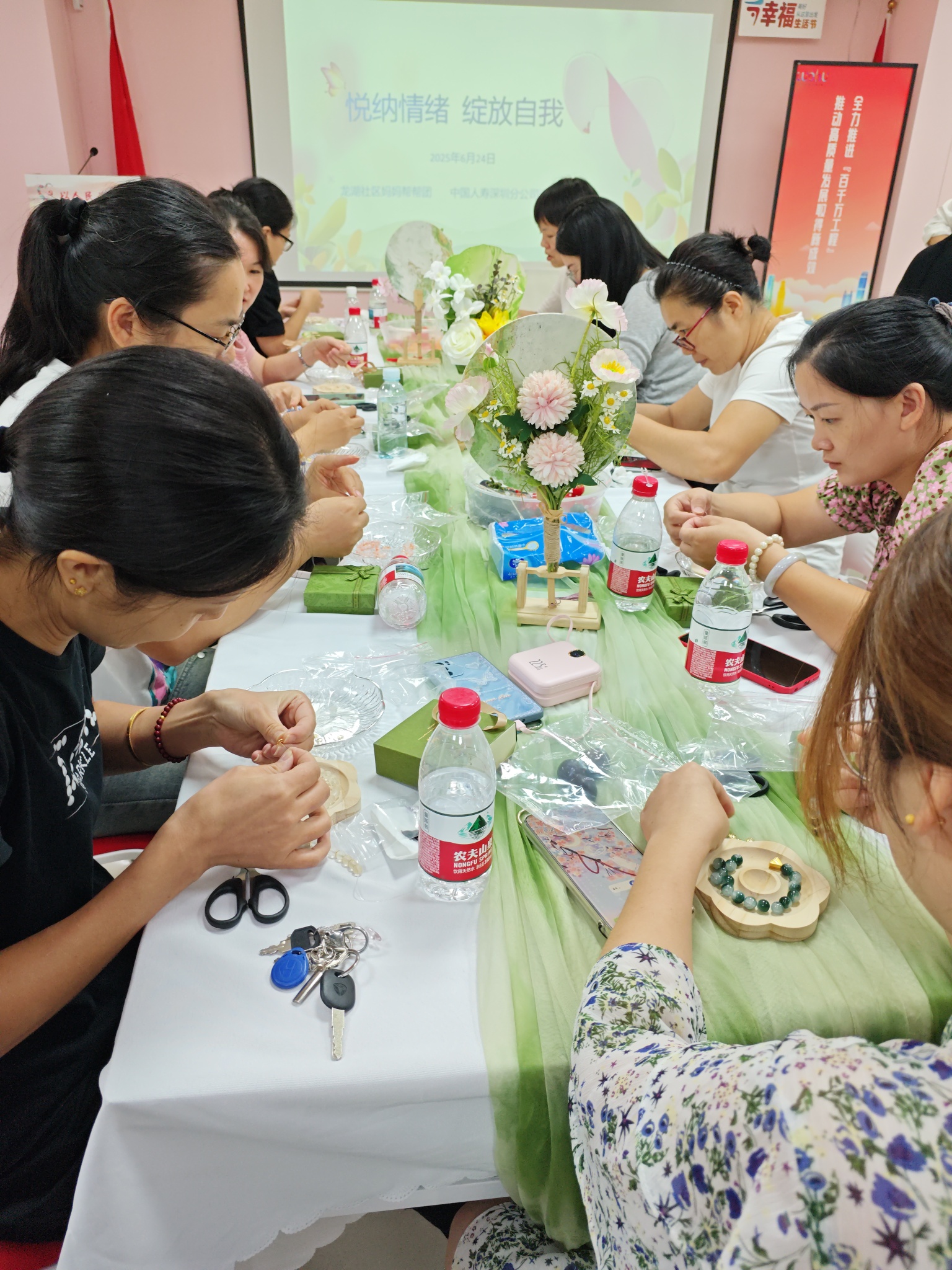 2025年6月24日上午,一场别开生面的“悦纳情绪,绽放自我——全职妈妈情绪管理+水晶手链 DIY 沙龙”活动在罗湖区清水河街道龙湖社区成功举办。此次活动由罗湖区妇联牵头,龙湖社区全职妈妈帮帮团、龙湖社区党群服务中心社工团队携手中国人寿深圳分公司洪湖支公司共同打造,旨在帮助全职妈妈提升情绪管理能力,在繁忙生活中寻得自我成长与心灵宁静。