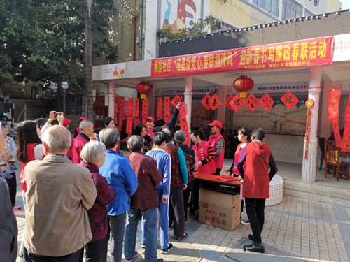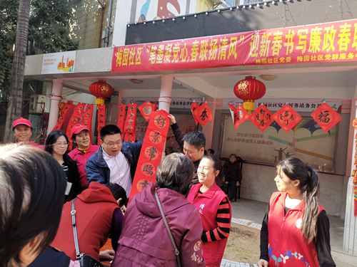 为庆祝中国传统节日“春节”的到来,弘扬廉政文化,1月14日下午,由罗湖区退役军人事务局、清水河街道办、清水河退役军人服务站联合梅园社区党委举办的“笔墨凝党心 春联扬清风”迎新春送春联活动在红岗西村文体广场热闹举行。