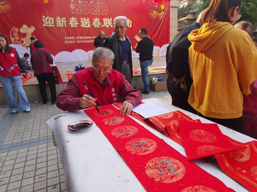 清水河街道党工委委员、党群部部长黄楚宇与社区党委书记曾建辉一起带领工作人员将一幅幅写满祝福的春联送到社区孤寡老人、老党员、贫困户、高龄老人家手上。现场送出春联200多副,福字100多张等。