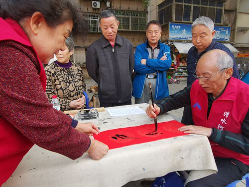 手写春联有着鲜明的中华传统文化特色,既是对节俭传统美德的继承,又是弘扬传统文化的契机,活动邀请3名专业书法家和4名社区退休老党员志愿者现场为社区居民写春联、送春联。广场上飘满墨香,志愿者们挥毫泼墨创作春联,一个个“福”字、一副副喜庆的春联跃然眼前。一句句真诚的祝福,寄托了居民辞旧迎新、接福纳祥的美好愿望,桌前挤满了前来求取春联的居民。