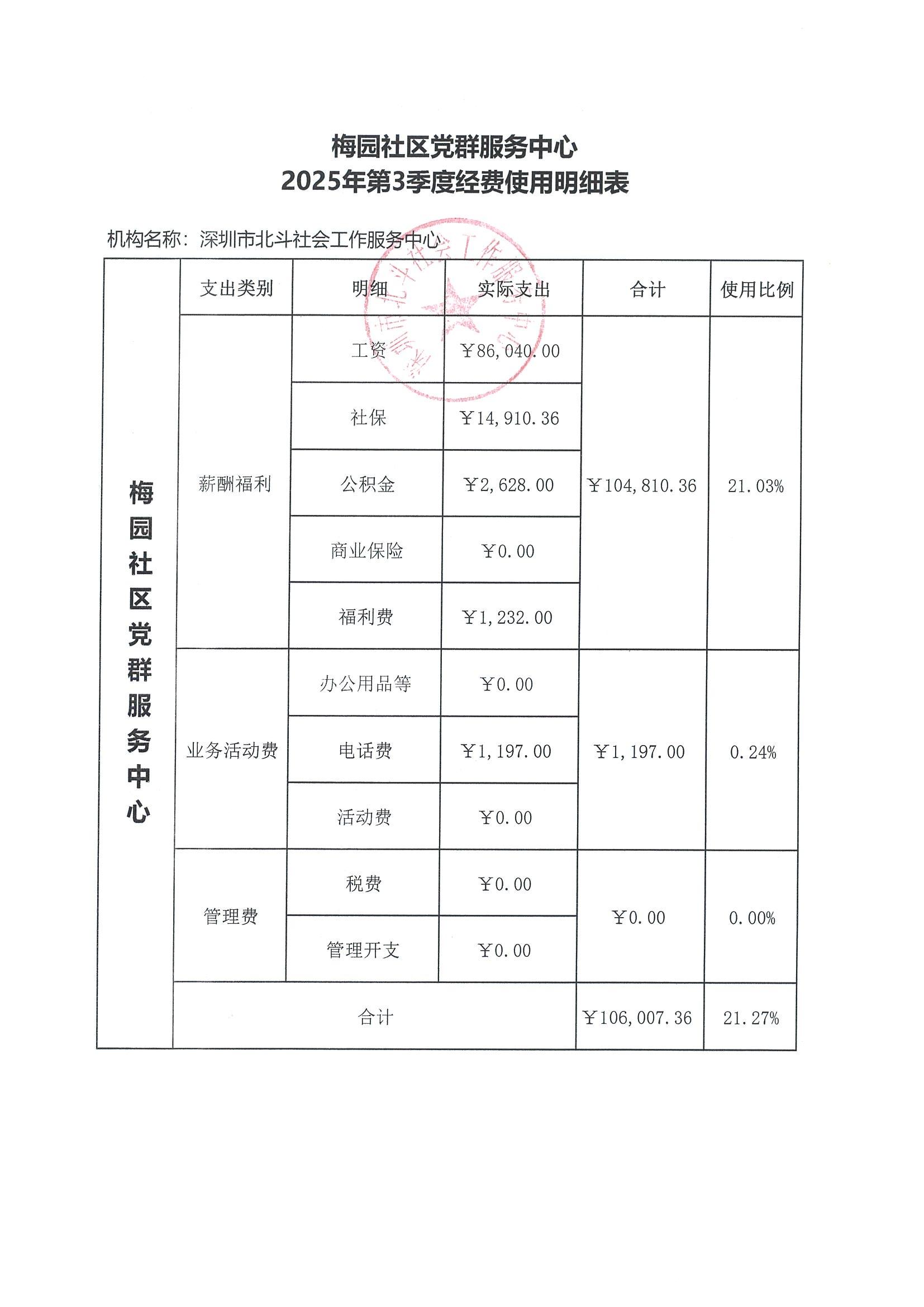 梅园社区党群服务中心2025年第3季度经费使用明细表