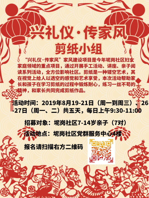 兴礼仪·传家风”家风建设项目是今年坭岗社区妇女家庭领域的重点项目,通过开展手工活动、讲座、亲子阅读系列活动,全方位影响社区。剪纸是一种镂空艺术,其在视觉上给人以透空的感觉和艺术享受,帮助家长和孩子在学习剪纸的过程中锻炼耐心,练习一丝不苟的精神。