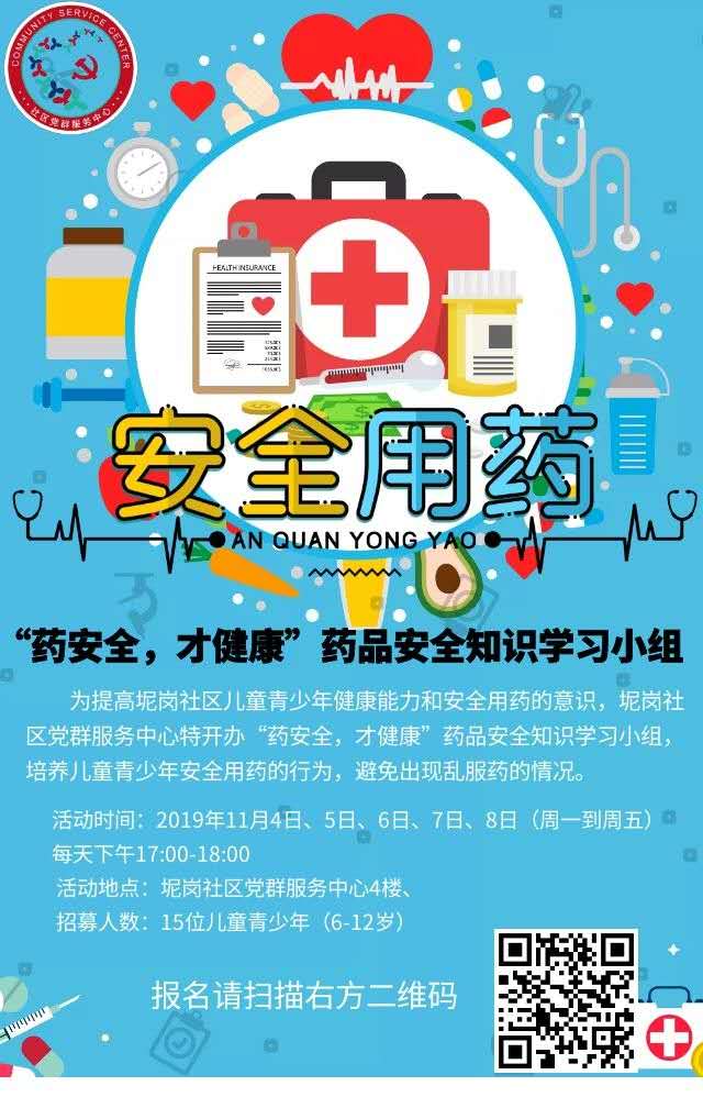 为提高坭岗社区儿童青少年健康能力和安全用药的意识,坭岗社区党委、坭岗社区党群服务中心特开办“药安全,才健康”药品安全知识学习小组,培养儿童青少年安全用药的行为,避免出现乱服药的情况。