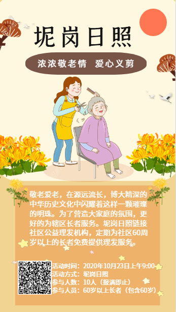 敬老爱老,在源远流长,博大精深的中华历史文化中闪耀着这样一颗璀璨的明珠。为了营造大家庭的氛围,更好的为辖区长者服务。坭岗日照链接社区公益理发机构,定期为社区60周岁以上的长者免费提供理发服务。