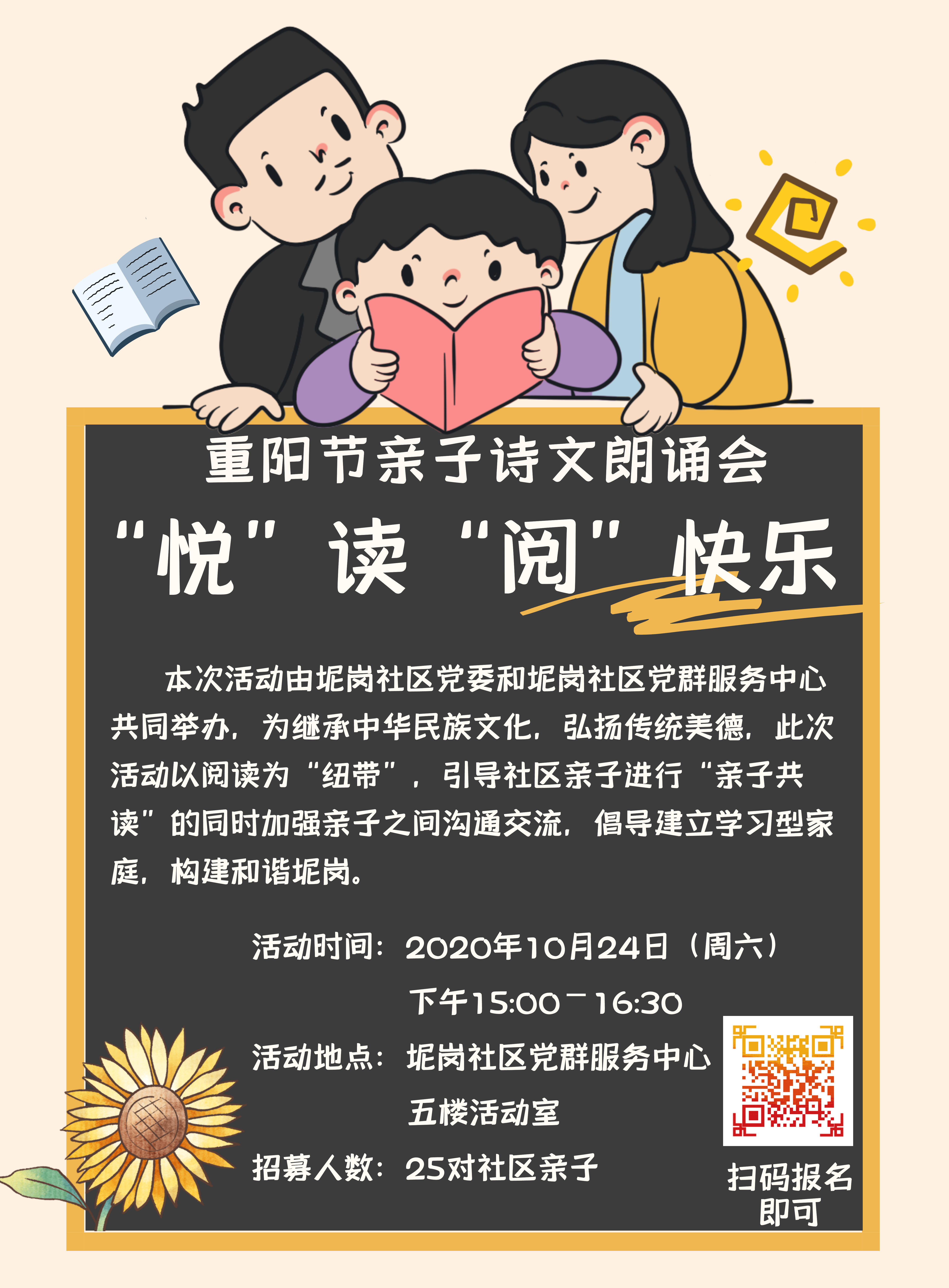 “悦”读“阅”快乐——重阳节亲子诗文朗诵会,期待您的参与!活动时间:2020年10月24日(周六)下午15:00-16:30活动地点:坭岗社区党群服务中心五楼活动室注:重阳节相关诗文由坭岗社区党群服务中心准备。神秘小礼品等你来拿