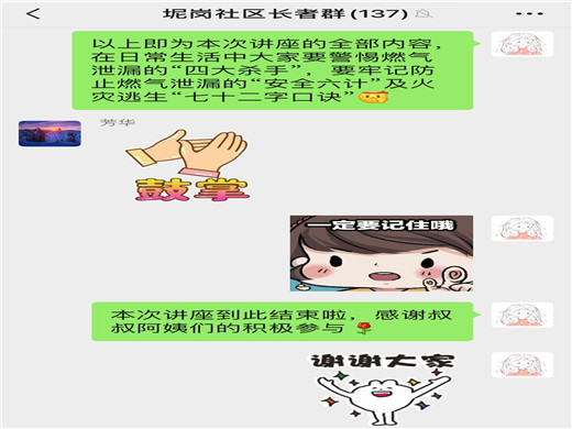 首先,本次讲座由最易引发燃气泄漏的“四大杀手”开始,工作人员通过图文结合的方式为长者们介绍了常见且危害大的燃气泄漏举动。其次,给长者们介绍了如何使用燃气的“安全六计”,即勤通风、常看护、巧自检、远避险、记关阀与护管路,通过深入浅出的讲解,加深长者们安全使用燃气的印象。接着,工作人员以提问的方式引出话题“煤气泄漏怎么办”,叔叔阿姨都踊跃发言,最后由工作人员进行总结得出“四不要原则”,即不要开火、不要开灯、不要开关任何电器及不要打电话,并告知长者需及时打开窗户通风、手动关闭阀门,前往安全场所后打119电话救援。