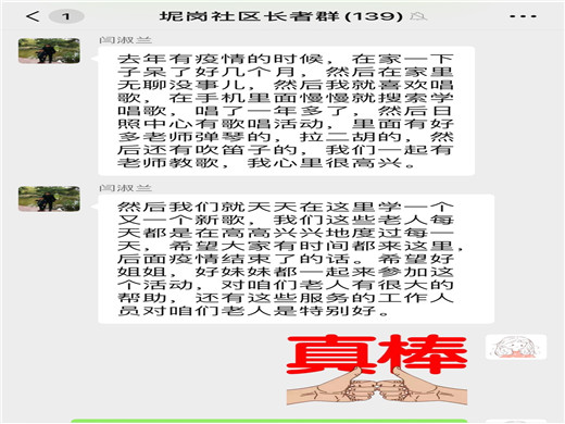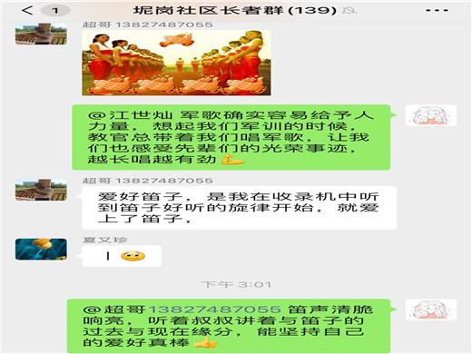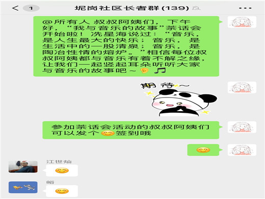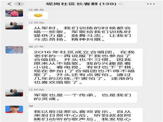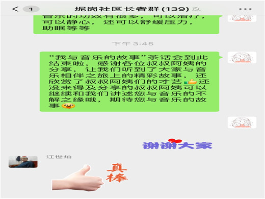 茶话会一开始,就有不少长者积极发言,有位吴叔是被“伯乐”相中,从不会唱歌到现在热爱唱歌,而且唱功了得;闫阿姨是因为疫情才开始接触音乐,进而变得热爱唱歌,练得一把好嗓子;还有位退伍军人江叔,参军二十载,与军歌相伴二十载,认为军歌给其带来力量,鼓舞斗志,现在日常也会时时哼着一些军歌。还有位吹笛子的刘叔叔在年轻时偶然从收音机里听到笛子的声音,便喜欢上吹笛子。后来中途被迫放弃了,直到50岁才又开始重新拾起笛子,坚持初心,培养兴趣,练成一技之长。还对我们说:“有一个爱好就像多了一个知己,在人生地不熟的时候,爱好就是最好的陪伴”。活动最后,还有长者进行了即兴的表演,从歌声中感受到音乐对其的影响。