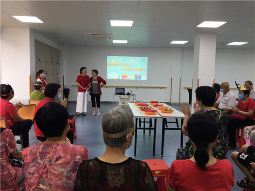 活动开始,主持人先介绍了日照中心团队成员,以拉近长者与工作人员的距离,也对各位长者的到场表示欢迎。接着工作人员组织大家一起玩“口令反转”暖场小游戏,长者们积极参与其中,摇头晃脑地摆起动作,还“揭发”周围动作做错的同伴,让同伴被“抓”到台上表演才艺。通过游戏增加长者之间的互动,带动气氛活跃起来,中心被欢笑声填满。气氛活跃之后主持人一一介绍了8月寿星“四朵金花”,还让其展示了个人才艺,促进彼此间的认识。随后,工作人员同中心歌唱教学活动的乐队组织了演奏会,以歌声作为献礼送给寿星,演奏了《绣荷包》、《送别》、《春苗出土迎朝阳》3首经典曲目,老师们配合默契,演奏声悦耳动听,很多叔叔阿姨还跟着哼唱起来。在活动高潮,乐队老师们带着大家一起为寿星们献上生日歌,工作人员将提前准备好的西红柿鸡蛋长寿面端上献给寿星们,然后邀请大家一起合影留念,一同纪念快乐而温馨的此刻。“这样的集体生日会很有意思,老人们聚在一起,很开心。”今年79岁的卫阿姨笑着说,“日照中心是老人们的另一个家,为老人们安享晚年提供了‘幸福窝’。”