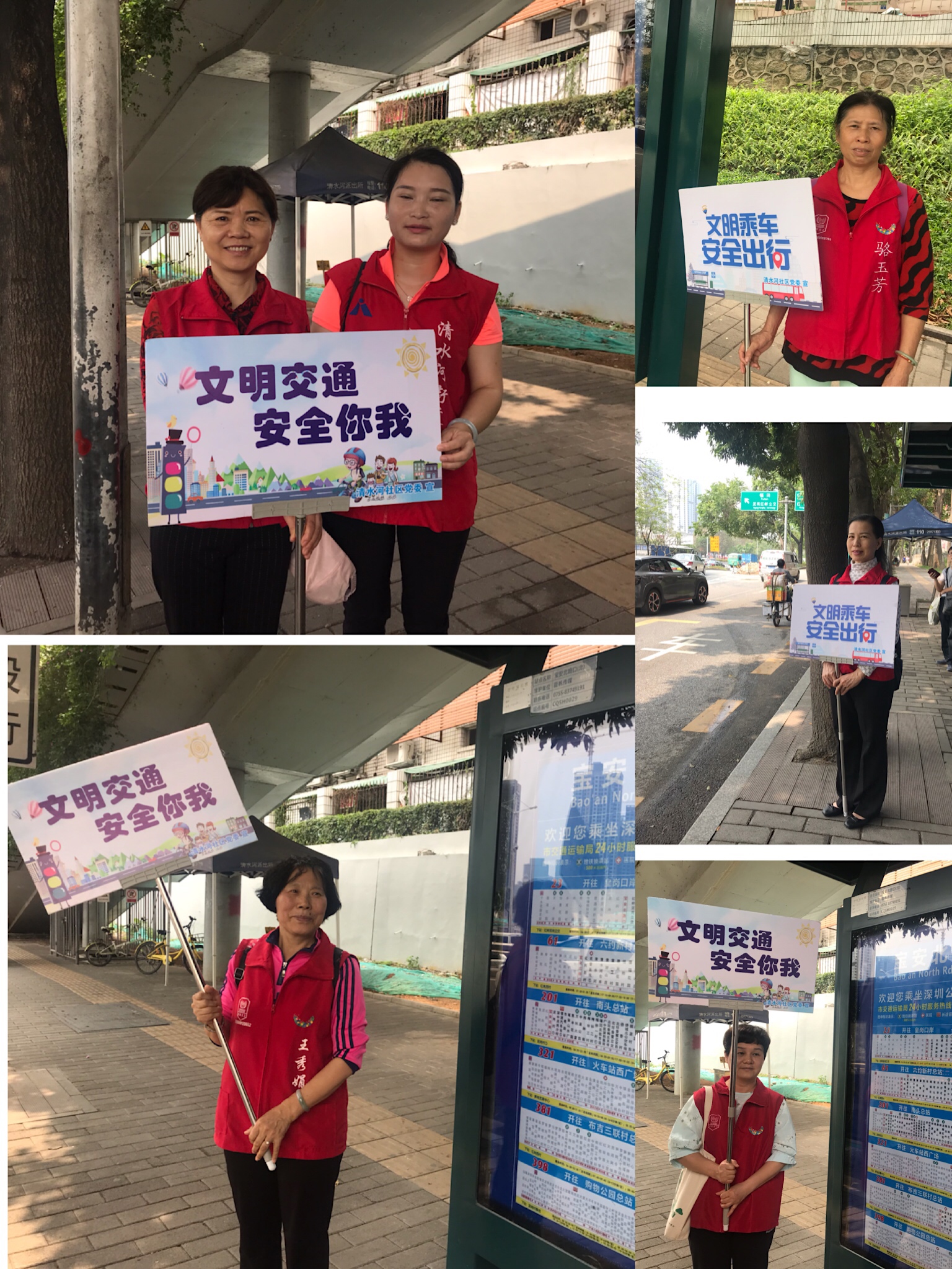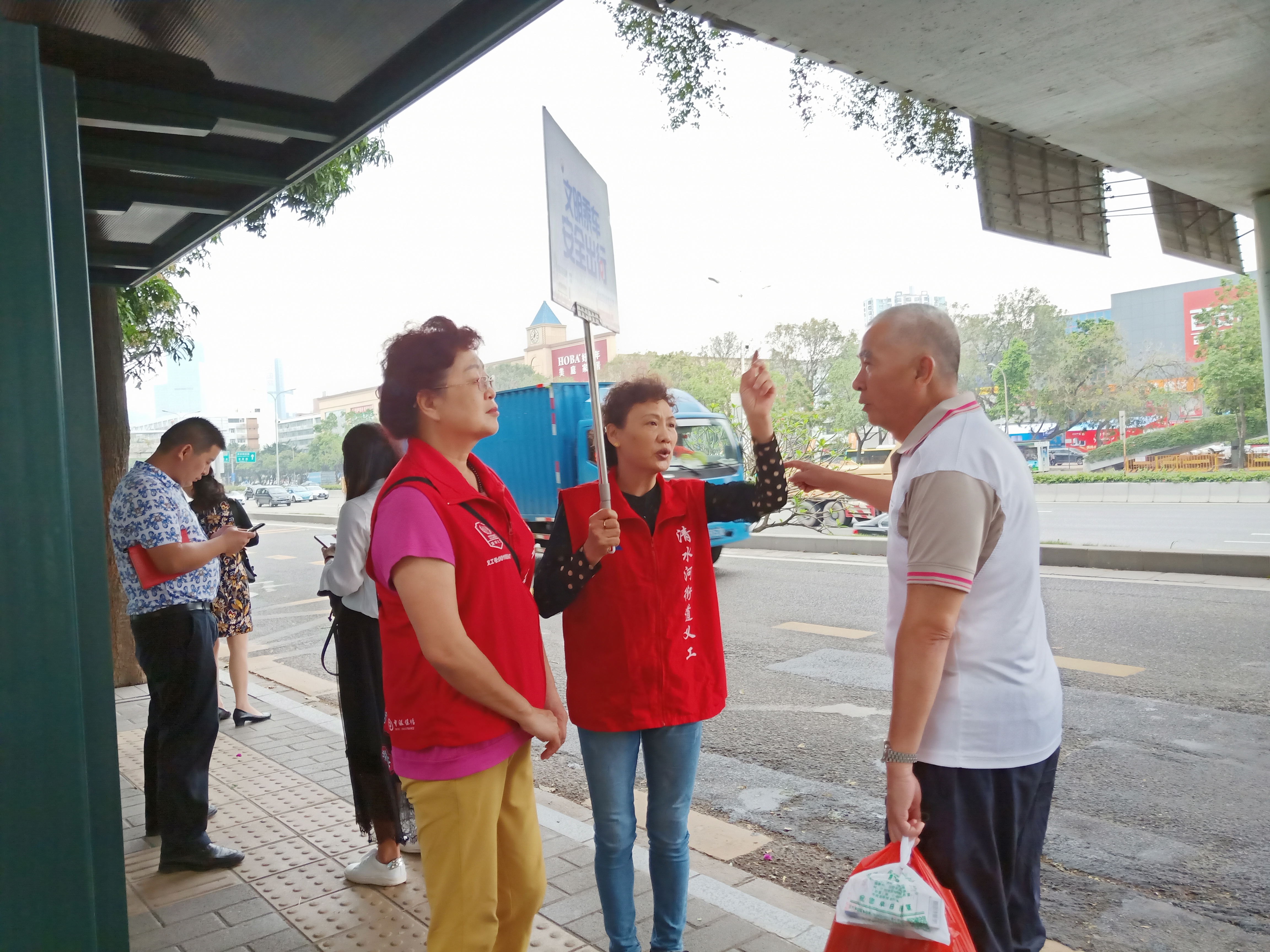 义工为了更直观、形象地表达文明交通的安全性手持安全出行提示牌分别在红岗花园及宝安北路口两个公交站台进行文明劝导活动。义工们在公交站台积极帮助有需要的居民选择合适的公交车并引导乘坐公交车的居民排队上车。同时,义工们还向居民倡导文明出行的理念,自觉抵制不文明交通违法行为,遵守交通法规,提高文明出行的意识。