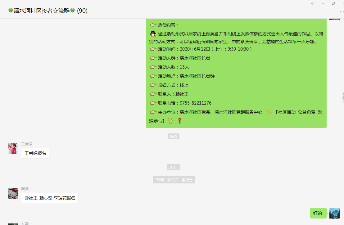 罗湖家园网讯:居家抗疫,服务不停,在清水河社区党委支持下,清水河社区党群服务中心于2020年6月12日开展“宅家生活有滋味”清水河社区美食工作坊。动形式以居家线上做美食并采用线上发微信群的方式选出人气最佳的作品。