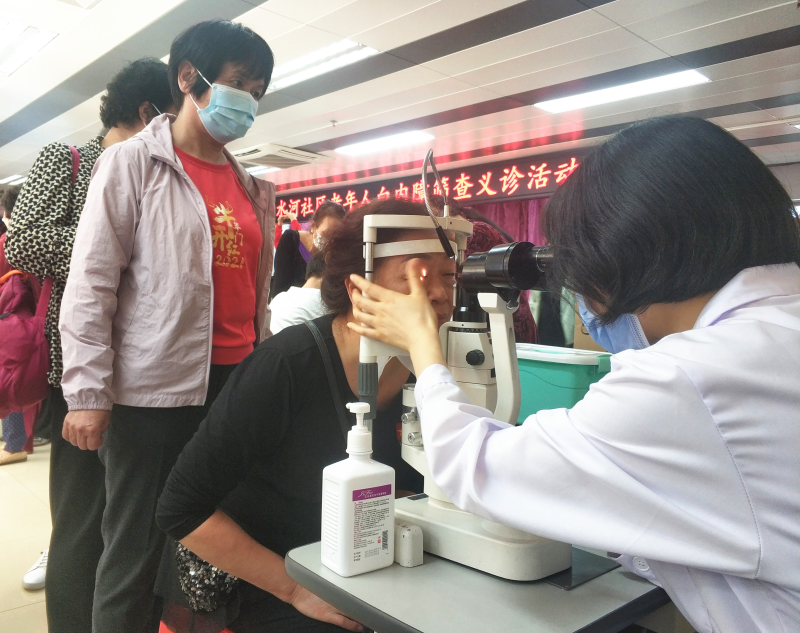 然后医护人员为居民仔细检查眼睛,主要以检测白内障、青光眼、散光为主,针对眼科常见疾病白内障进行筛查与诊断,耐心地向前来就诊的居民分析情况,并给眼部出现异常的居民提出了治疗建议。