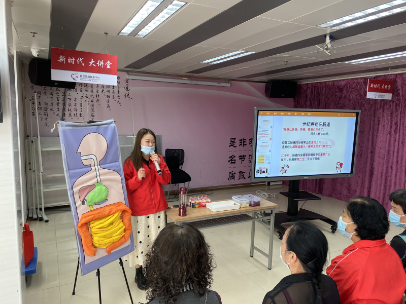 社工特邀益力多乳品有限公司叶老师为社区居民讲解肠道健康知识,叶老师用简单易懂的PPT及运用生动有趣的消化系统模型、有奖问答等环节让大家了解肠道健康知识,介绍了肠道保健方法,居民们认真听并积极参与互动。