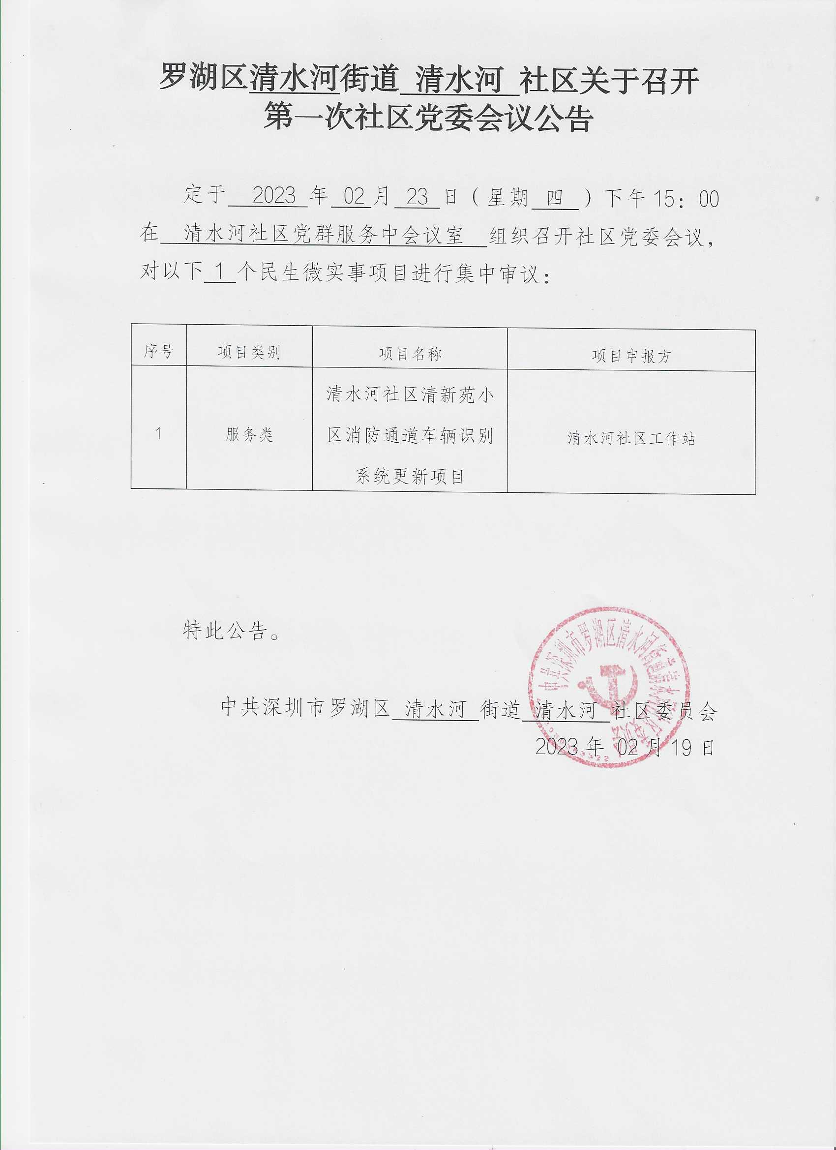 罗湖区清水河街道清水河社区关于召开第一次社区党委会议公告