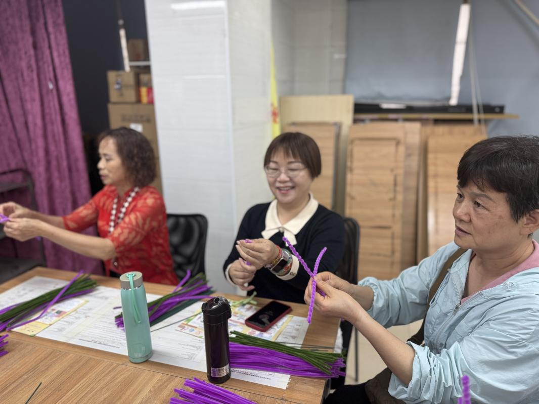 活动现场,桌上摆满了紫色扭扭棒、绿色花艺胶带等材料,宛如一座春日花园。社区工作人员首先播放了一段薰衣草制作教学视频,展示了从花瓣缠绕到花束成型的全过程。随后,手工老师现场示范,一边讲解“花瓣需卷出自然弧度”“枝叶要错落分布”等技巧,一边穿插薰衣草的文化寓意:“薰衣草象征安宁与祝福,愿这份美好常驻大家心间。”居民们听得专注,不时点头记录,跃跃欲试。