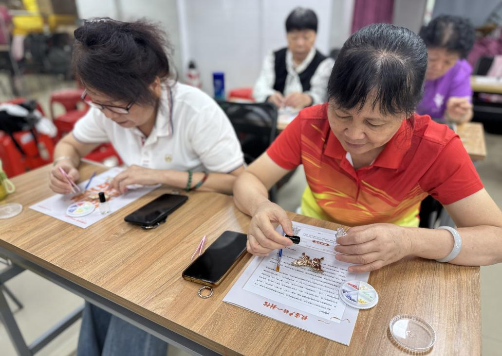 居民们随即在老师的指导下沉浸创作:选择银坯勾勒轮廓,耐心比对贝片纹理,小心涂覆特制胶液再谨慎贴嵌……社区居民陈阿姨将亲手制作完成的胸针置于掌心反复端详:“这小小蝴蝶真像活起来一样,每变换下角度就流光溢彩。亲手做出来才知道,这个活动举办太有趣了。”