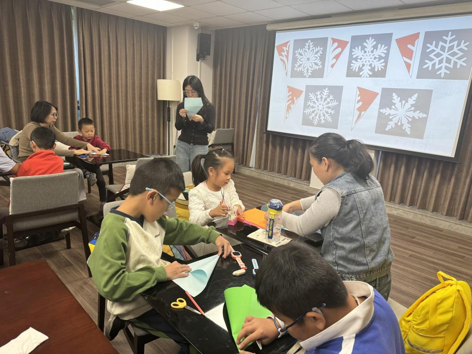 创意实践环节中,亲子家庭以“雪花”为灵感源泉,在彩纸上挥洒创意。孩子们手持剪刀,在家长的协助下将平面纸张化作灵动的六角冰晶,每一片“雪花”都承载着童真与想象。活动现场,老师还现场示范传统技法,让亲子家庭在剪裁间感受非遗文化的精妙。部分优秀作品被装裱为社区文化墙装饰,成为社区文化记忆的生动载体。