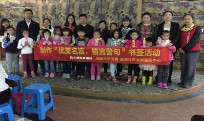 为了丰富社区青少年儿童的课余生活,提高他们阅读的情趣,增进家长与孩子之间的亲子关爱情感。2016年11月26日下午2:30开始银湖社区党委、银湖社区党群服务中心于齐明别墅社区管理处会议室开展了一场民生微实事项目之制作“优美名言,格言警句”书签活动。