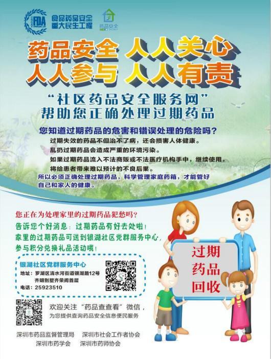 为普及药品安全科学知识,提高社区居民的安全用药意识和水平,银湖社区党群服务中心持续为居民用药安全提供专门的回收点。社工提醒社区居民定期清理家庭药箱,向社区居民讲解如何分辨过期、变质失效药品,以及服用过期药品对身体的危害和过期药品随意丢弃的危害、过期药品回收的流程、过期药品的去向等,提升居民科学处理过期药品的意识。