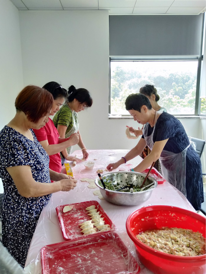 活动开始之前,已经有许多 “美食达人”陆陆续续地来到活动场地,并带来了自己的“拿手好菜”,在社工与工作人员的引导下,在桌子上摆放好食物,准备与社区内的邻居们一起共同分享。除此之外,十几名“饺子达人”一大早也来到活动现场,揉面的揉面,剁馅的剁馅,他们分工协作,一盘盘香气四溢的饺子很快就出锅了。