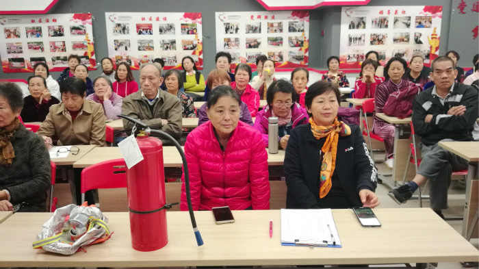 来自深圳市消安防火宣传中心的吴教员通过真实案例视频向大家展示了火灾发生后的严重后果及发生火灾时的安全疏散与逃生知识,以此来敲响大家心中消防安全的警钟。吴教员强调家庭消防安全重在预防,平时不仅要养成良好的安全用水用电用气习惯,而且要养成定期检查水电气设施的习惯。针对大多数老年人普遍存在的消防安全意识不强、消防知识缺乏、消防自救能力不强的问题,吴教员从普及防火知识的角度出发,结合冬季火灾易发的原因和社区居民日常生活中的火灾隐患,向在场老人介绍了火灾初期的扑救方法、火场逃生的办法,以及用火、用电、用气方面的注意事项等消防安全知识。