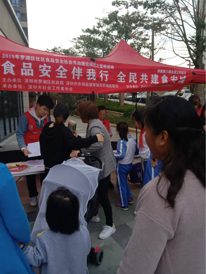罗湖家园网讯: [2019年12月16日]“民以食为天,食以安为先”,食品的安全与否关系到每一个市民的切身利益,时刻都不能放松。为了让更多人了解食品安全科普知识,让居民吃得安全、吃得放心、吃得健康。近日,银湖社区党委、东西方社工服务社银湖社区党群服务中心联合罗湖区民政局、深圳市市场监督管理局、深圳市社会工作者协会在银湖社区共同开展2019年民生微实事“社区食品安全社会共治建设项目”食品安全宣传活动。