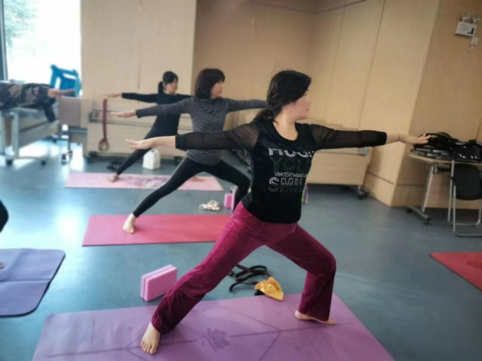 课堂上,老师让学员进行一个热身运动和呼吸的调整,紧接着老师开始示范入门瑜伽的动作。大家在老师的指导下通过调节呼吸的方式和节奏来放松和舒展身体。在老师细致的教学和指导下,学员们在轻松的氛围中体验瑜伽的独特魅力,在运动中修养身心。