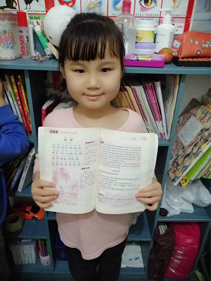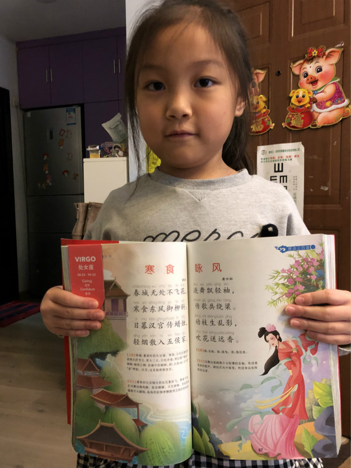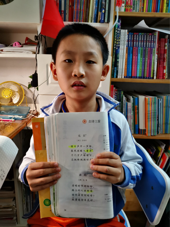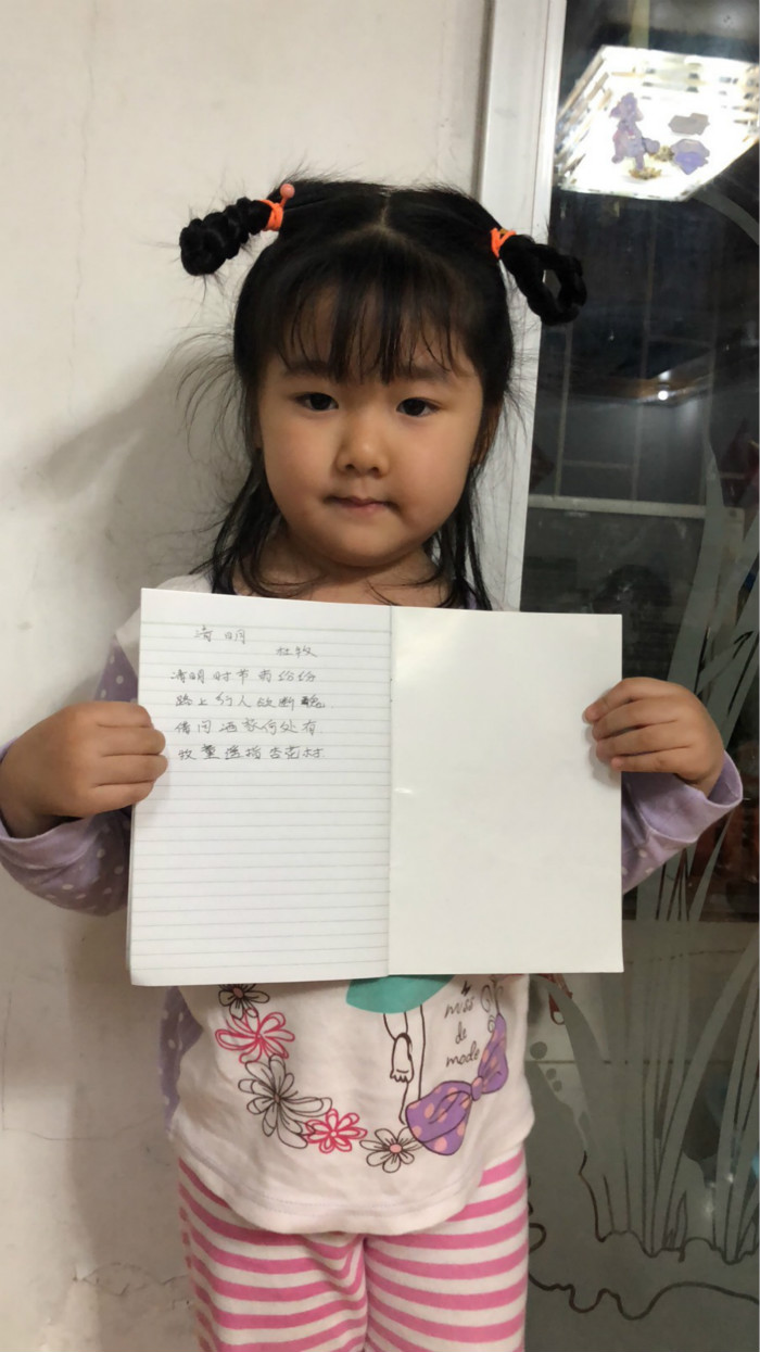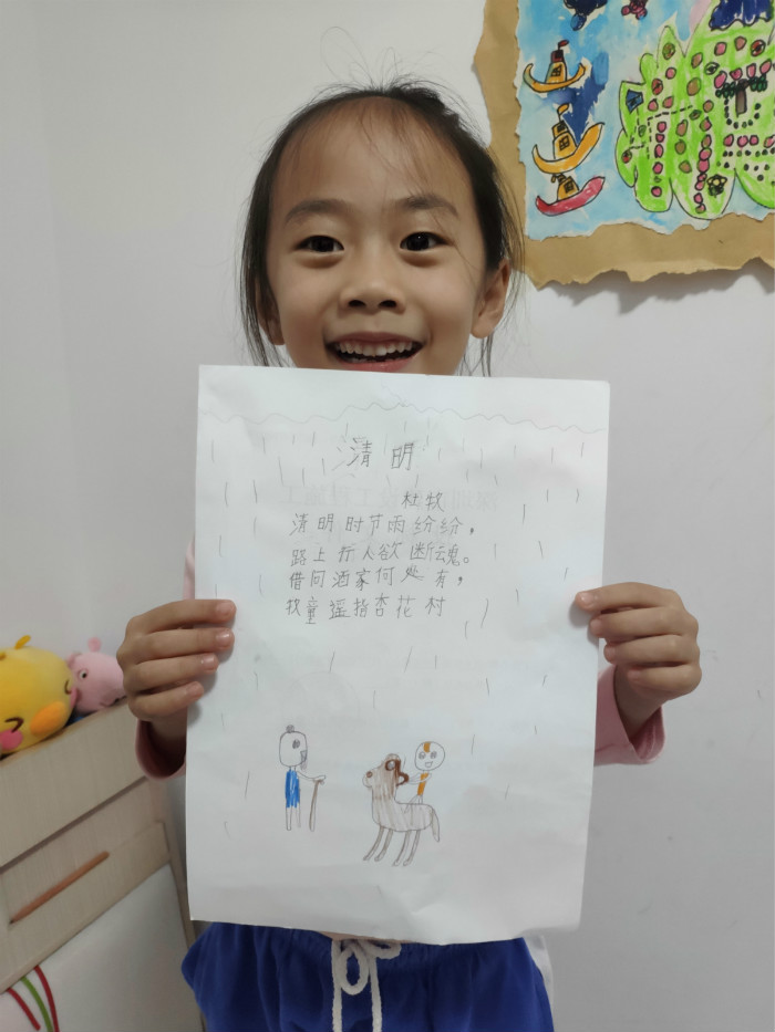 社区共20名4-12岁孩子们参加了本次活动,他们充分发挥聪明才智,或自己找已学过的诗词,如历来广为传诵的唐代杰出诗人杜牧写的《清明》;或在爸妈帮助下,在必背的小学古诗词中找到的被后人称为诗圣的唐代著名现实主义诗人杜甫的《春夜喜雨》;抑或者是唐代诗人韩翃创作的七绝《寒食》,再比如唐代白居易的《清明夜》,唐代李建勋的《清明日》,唐代张继的 《闾门即事》等等。孩子们均在家人的协助下,拍照打卡,拍诵读视频上传到群里面。非常投入和给力。