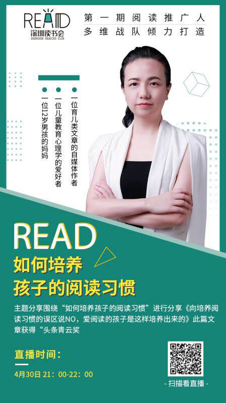 主题分享围绕“如何培养孩子的阅读习惯”进行分享,4月30日晚上9点-10点,有兴趣的居民朋友可直接扫码看老师直播分享