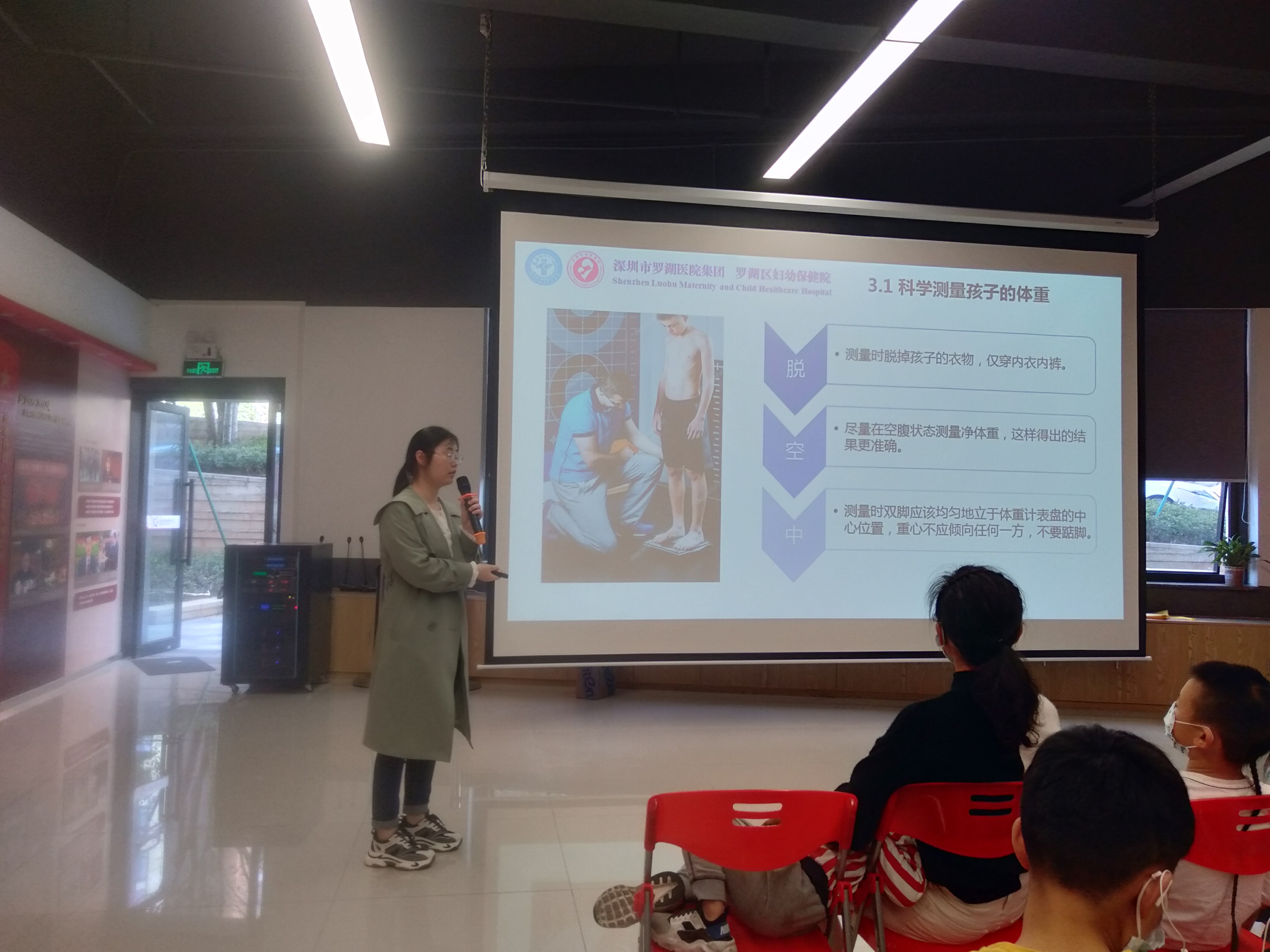 本次活动邀请到了罗湖区妇幼保健院的心理门诊医生候医生,负责矮小和性早熟专科门诊的主治医生余医生,以及负责儿童保健的杨医生来到现场为大家进行专业讲解与答疑。首先,侯医生为亲子们讲解儿童保健知识。活动现场,侯医生结合PPT及现场演示,通过分析儿童超重肥胖现状、肥胖防控的重要性,让家长们了解超重肥胖危害多,需要及时防控;同时,通过案例,让家长们学会测量身高体重以及BMI值的计算方法,让家长们能准确测量和评估,及时进行早期干预;最后,向家长们介绍常见的防控方法,进行科学饮食和喂养,促进儿童健康成长。讲解完成后,小朋友们在义工的带领下,排队进行测量身高体重。活动现场,余医生不仅主要负责帮助幼儿们测量身高体重,同时还解答大家关于矮小和肥胖的相关问题。除此之外,负责儿童保健的杨医生也在现场帮助小朋友们测量身高体重,计算BMI,以及评价体重状态。